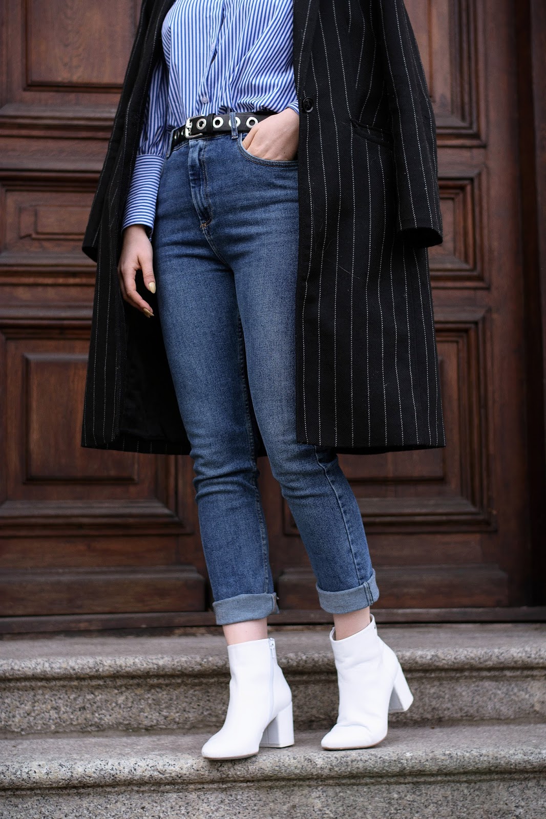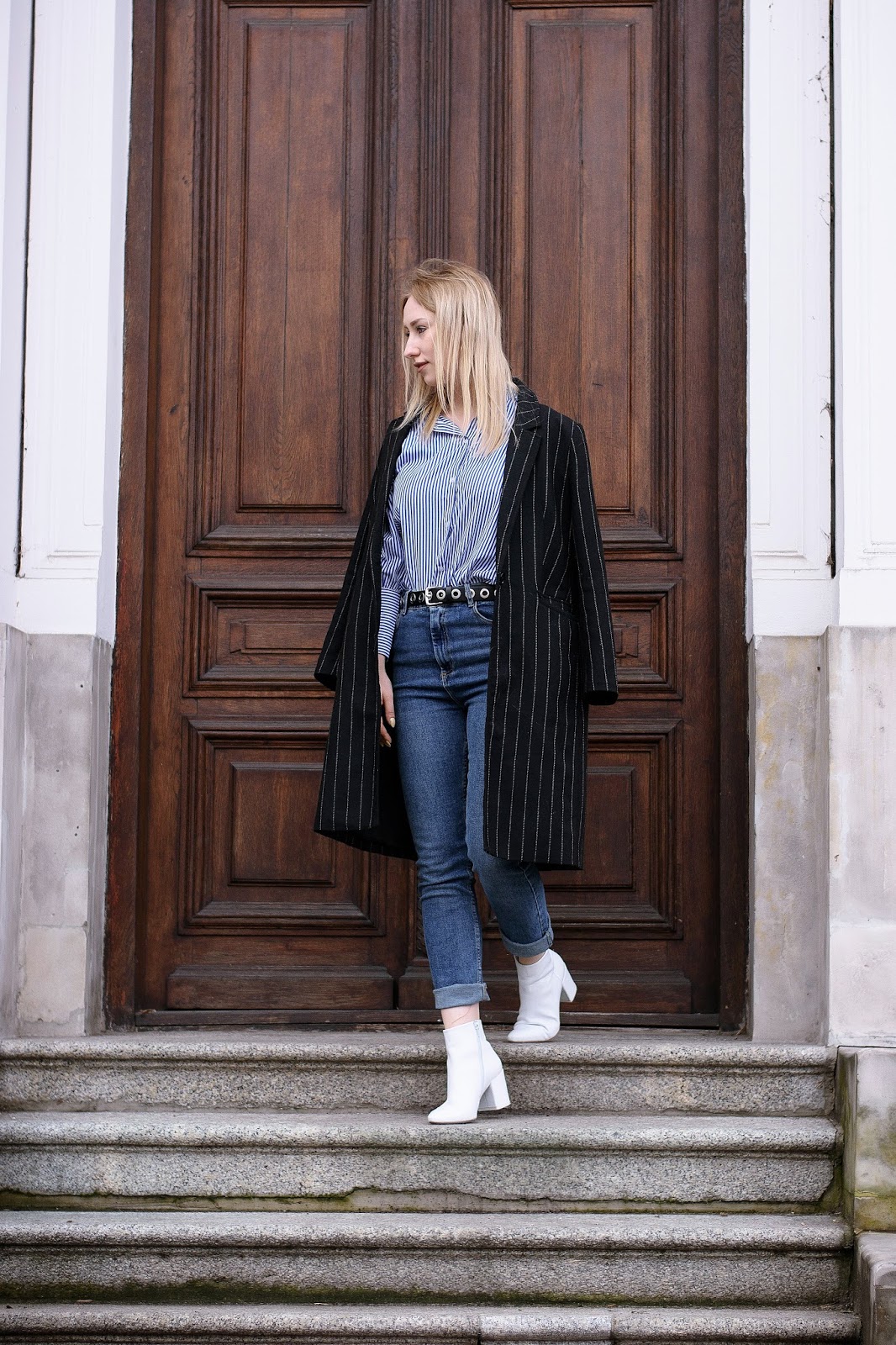 Całość uzupełniłam białymi botkami oraz płaszczem w prążki. Dajcie znać, czy lubicie takie połączenia?