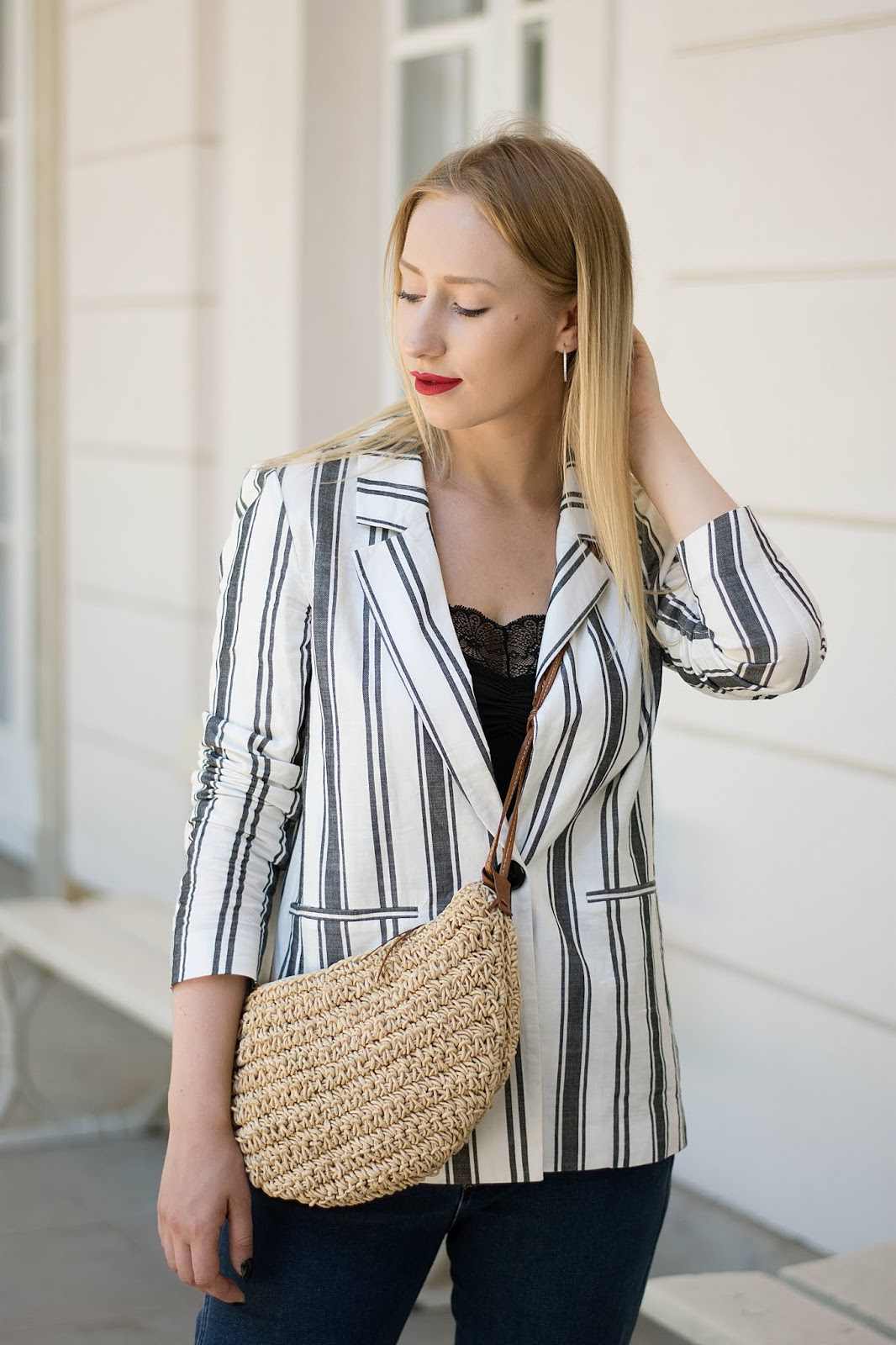 Zobacz oryginał pon., 02/07/2018 - 17:43Miewam dni, kiedy najchętniej włożyłabym bluzę oraz adidasy, ale są też chwile, gdy wybieram marynarkę i eleganckie buty. Tym razem postawiłam na przepiękną marynarkę w pasy, która od razu przypadła mi do gustu. W połączeniu z ciemnym jeansem tworzą spójną, codzienną całość. Swoją drogą owa marynarka pochodzi z Reserved! Tak, tak – tej polskiej marki, którą coraz częściej oznaczam na swoich social mediach i każdy z Was pewnie ją świetnie zna z widzenia, ale często piszecie mi, że nigdy nie wchodziliście. Dopiero z mojego polecenia kupujcie tam różne perełki. Sama przez kilka lat zapomniałam o jej istnieniu, ale od 3–4 sezonów to jeden z moich ulubionych sklepów, do którego naprawdę często zaglądam. Uwielbiam wspierać nasze polskie marki, które coraz bardziej się rozwijają.