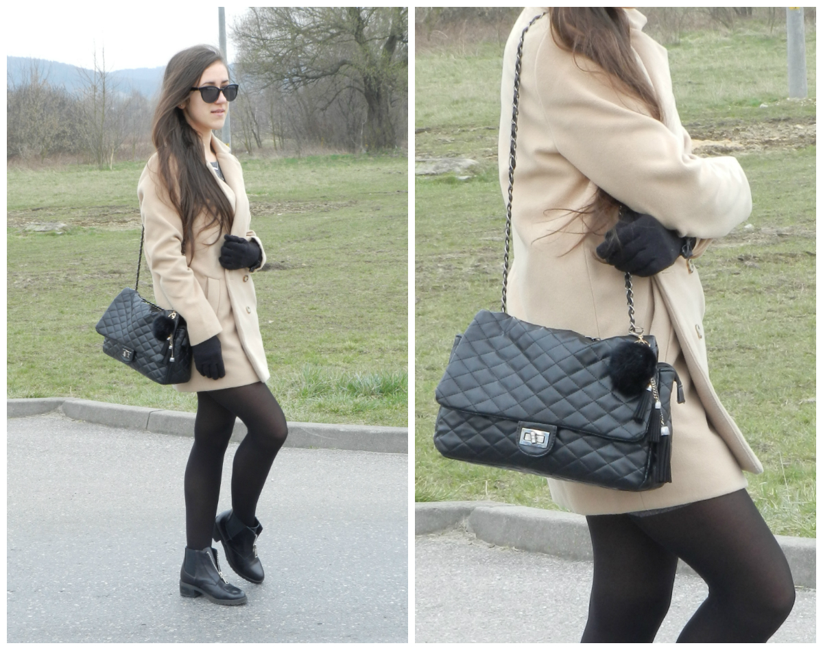 DRAPOWANA SUKIENKA, KARMELOWY PŁASZCZYK I KOCIE OKULARY