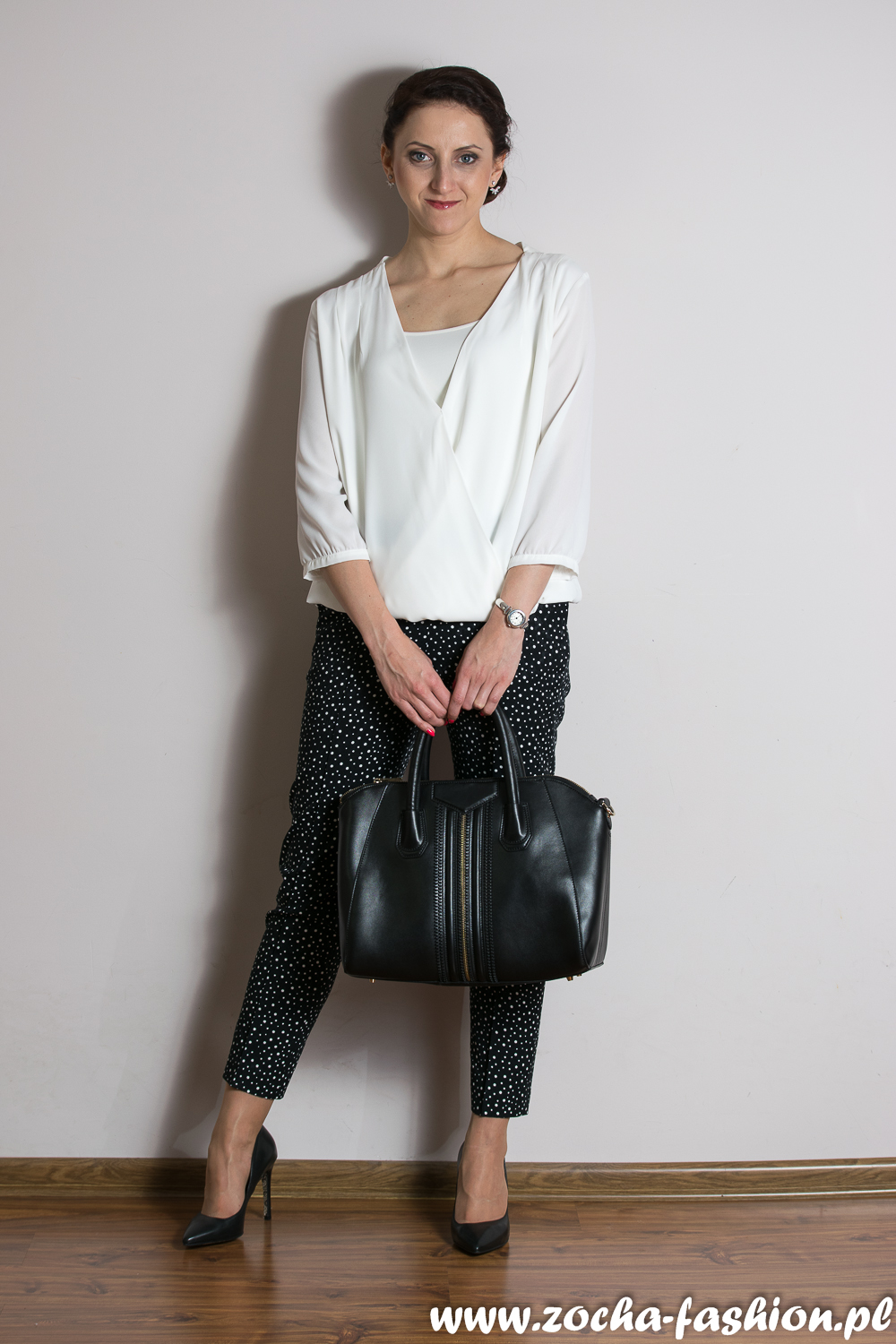Zobacz oryginał pon., 21/03/2016 - 09:11Nic nadzwyczajnego - czarno biały zestaw. Elegancko, kobieco, stonowanie czyli tak jak lubię. Aby nie wdała się nam monotonia pobawiłam się trochę wzornictwem i strukturą. Mam tu na myśli spodnie cygaretki w kant posiadające różnego rodzaju wielkości kropeczki oraz bluzkę posiadającą kopertowy fason. Dzięki własnie tym detalom strój nabiera bardziej wyrazistego charakteru. Całość dopełniają klasyczne czarne czółenka, torba w tym samym kolorze, eleganckie, srebrne kolczyki nausznice oraz zegarek. Black &White - nic dodać, nic ująć ;)