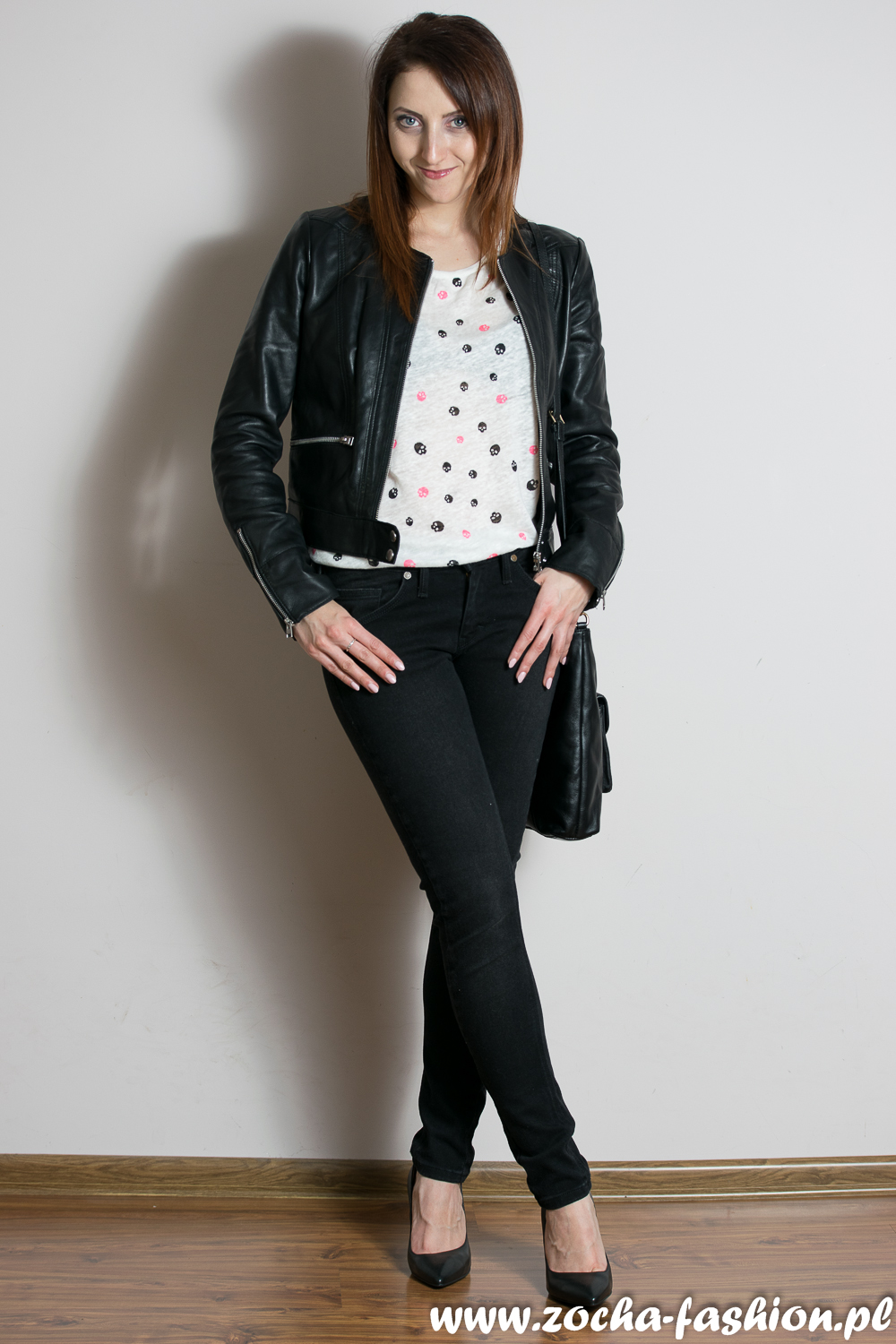 Dziewczyna Rockmena czyli skórzana kurtka, obcisłe spodnie i bluzka w czaszki