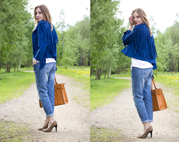 Zobacz oryginał ndz., 22/05/2016 - 09:30Czy zdarzyło się Wam kiedyś zobaczyć jakąś rzecz w sklepie i powiedzieć głośno "wow!!"? Myślę, że odpowiedź nie tylko jest twierdząca ale i z dodatkiem "oj i to nieraz". Ja właśnie ostatnio mam z tym mały problem, ponieważ większość rzeczy jakie widzę jest fajna, ale ... krótko mówiąc "szału nie ma, d..y nie urywa". Dodatkowo zabierając na zakupy ukochanego, który praktycznie za każdym razem robi tą swoją uroczo kwaśną minkę mówiącą jedno "na serio TO Ci się podoba...?" odechciewa się wtedy nawet jakiegokolwiek szukania. Na szczęście los czuwa nad takimi jak ja i od czasu do czasu udaje się przypadkiem upolować coś ciekawego. Zamszowa kurtka z frędzlami wzbudziła we mnie miłość jak tylko na siebie wpadłyśmy między sklepowymi regałami i nie mogło być inaczej. Strzała amora poszła w obieg i musiała być moja.