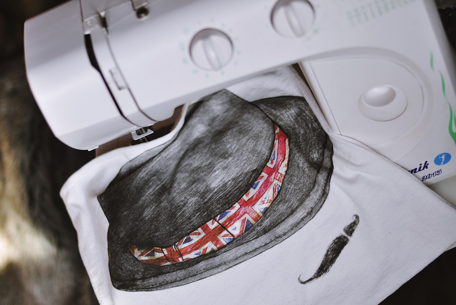 Jak już zdążyliście zauważyć na pierwszym zdjęciu, potrzebne nam będą: koszulka, nożyczki, igła i nitka. Ja troszkę ułatwiłam sobie sprawę i użyłam maszyny do szycia... choć po jakichś dwóch latach niekorzystania z niej, pół godziny zajęło mi ponowne przypomnienie sobie co i jak, odnalezienie wszystkich elementów i zamontowanie ich.