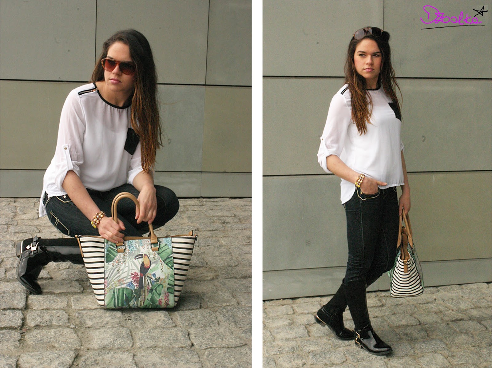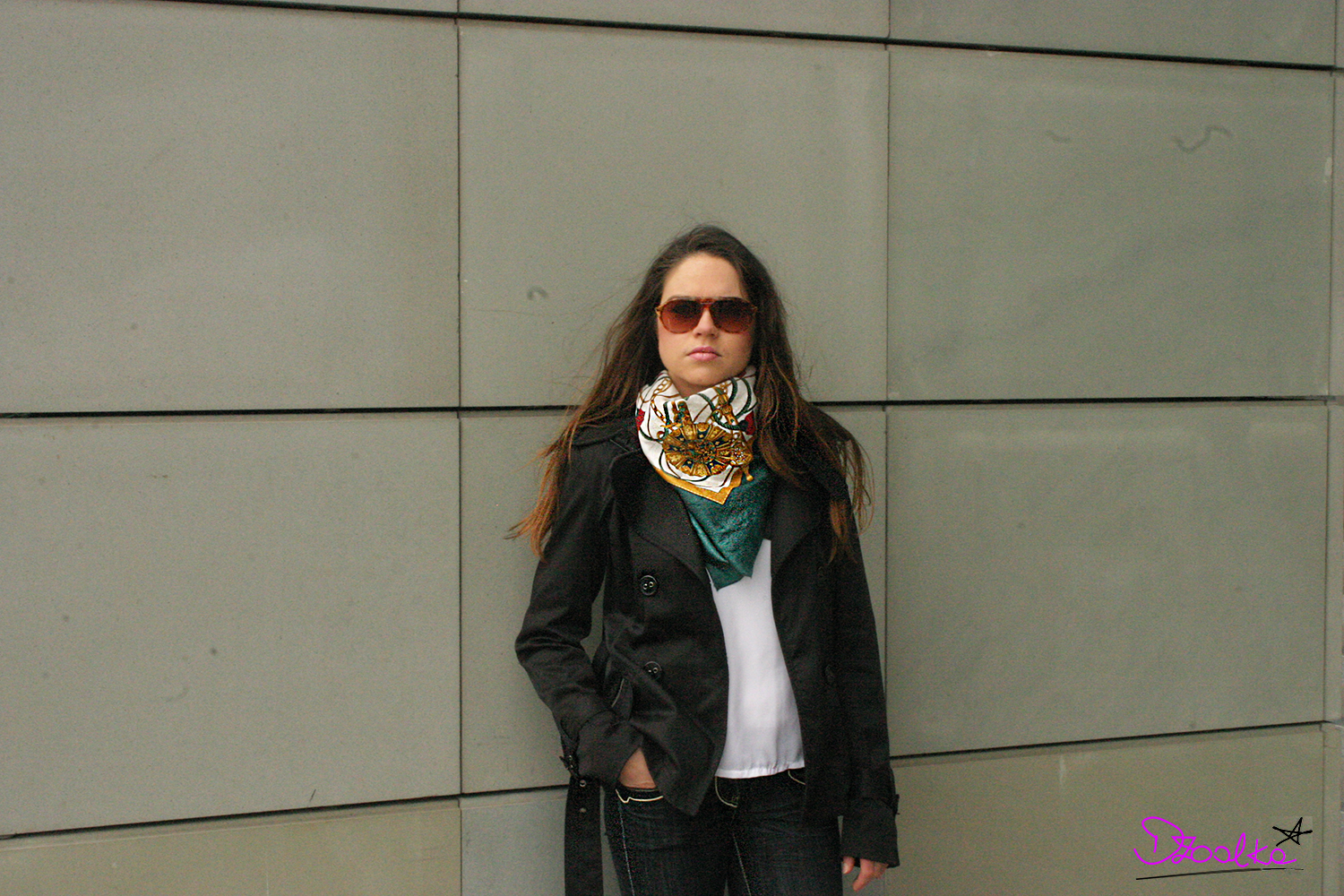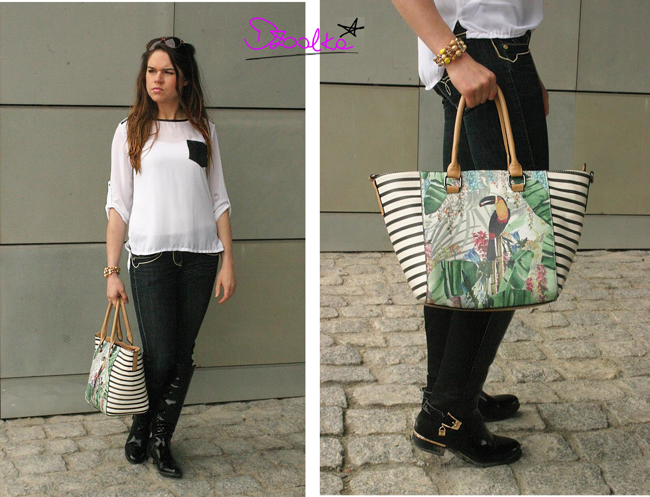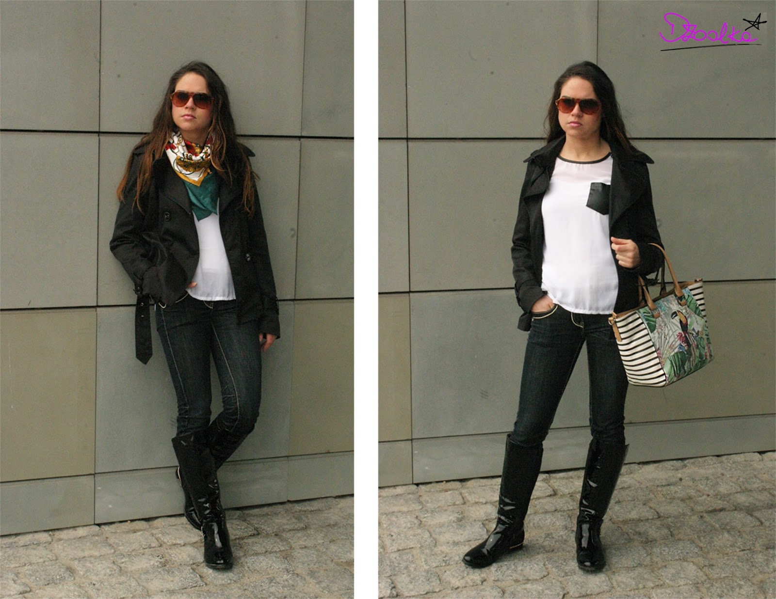 Torebka z tukanem doskonale ożywiła całość i dopasowała się do zielonej chusty z motywem łańcucha Coco Chanel, którą ostatnio pojawiała się w moich stylizacjach dość często (min. Tweedowa Klasyka i Bryczesy vol.3).