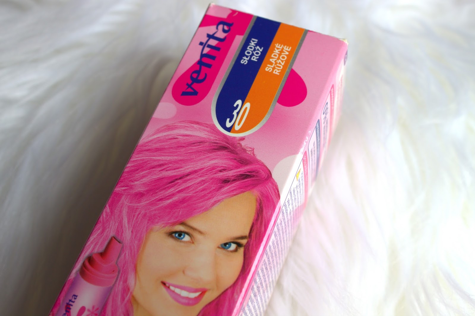 Produktem do nietrwałej koloryzacji, którego użyłam była pianka do włosów firmy Venita, trendy color mousse o numerze 30 - słodki róż. Zakupiłam ją na Allegro za około 12-14 złotych, a więc bardzo, bardzo tanio. W zeszłym roku, kiedy to farbowałam moje włosy po raz pierwszy także użyłam tego kosmetyku i byłam z niego naprawdę zadowolona, przede wszystkim przez łatwość jego nakładania, konsystencję oraz samą strukturę farby, bo jak już wspomniałam jest po prostu pianką oraz żywość i głębokość samych kolorów.
