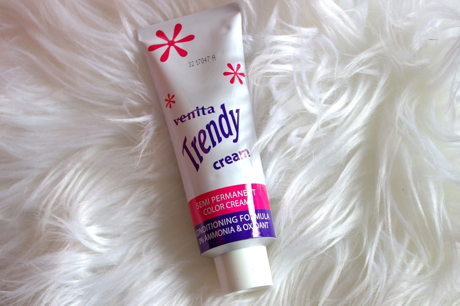 Przyznaję, iż trochę czasu myślałam, co by na tych moich włosach znów stworzyć i stwierdziłam, że kolejna jednokolorowa fryzura będzie po prostu się nudna. Dlatego też postanowiłam użyć aż trzech kolorków tonerów w kremie marki Venita - Trendy cream. Jest to koloryzacja półtrwała, utrzymująca się do dwóch tygodni i wypłukująca się z każdym kolejnym myciem głowy. Z tego względu produkt nie zawiera amoniaku, utleniaczy i PPD. Możecie być więc pewni, że nie zniszczy wam włosów tak mocno, jak zwykła, trwała farba.