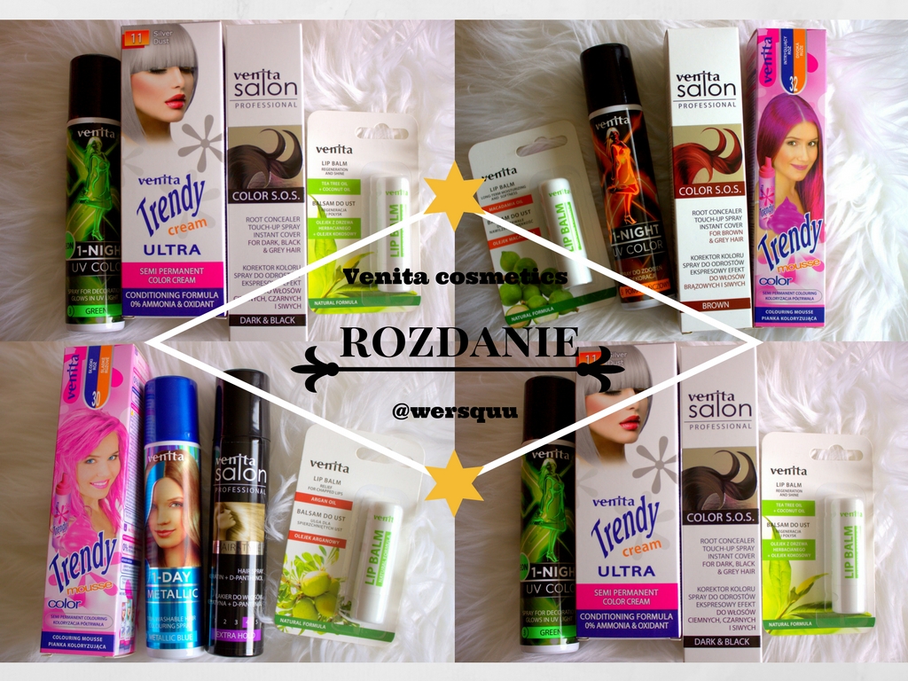 Dla wytrwałych osób, które czytają "wypociny" innych do końca mam bardzo interesującą niespodziankę. Wraz z firmą Venita przygotowałam dla was trzy zestawy, składające się z produktów tej marki. Tak naprawdę każdy z biorących udział w rozdaniu, kto spełnił wszystkie wymagane punkty, określone przeze mnie może zostać wylosowany i zdobyć jeden z trzech zestawów z kosmetykami. Zasady są naprawdę proste, a nagrody ciekawe i kuszące. Wystarczy: