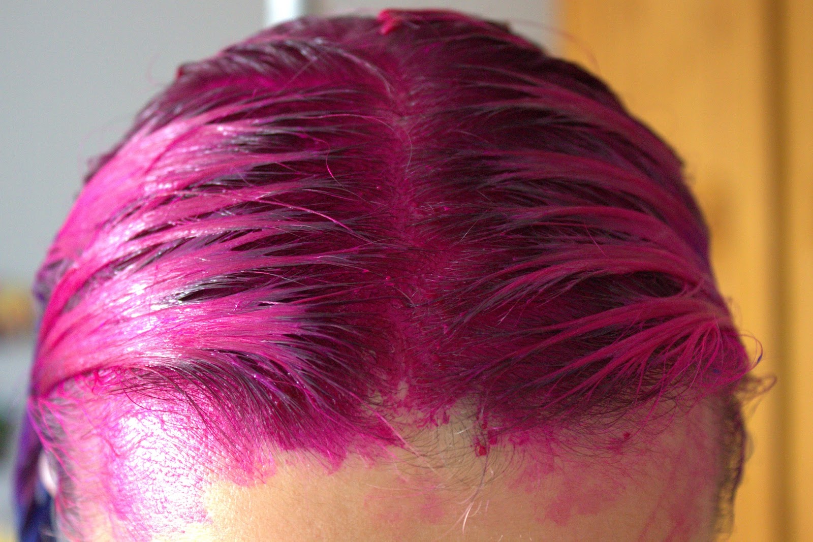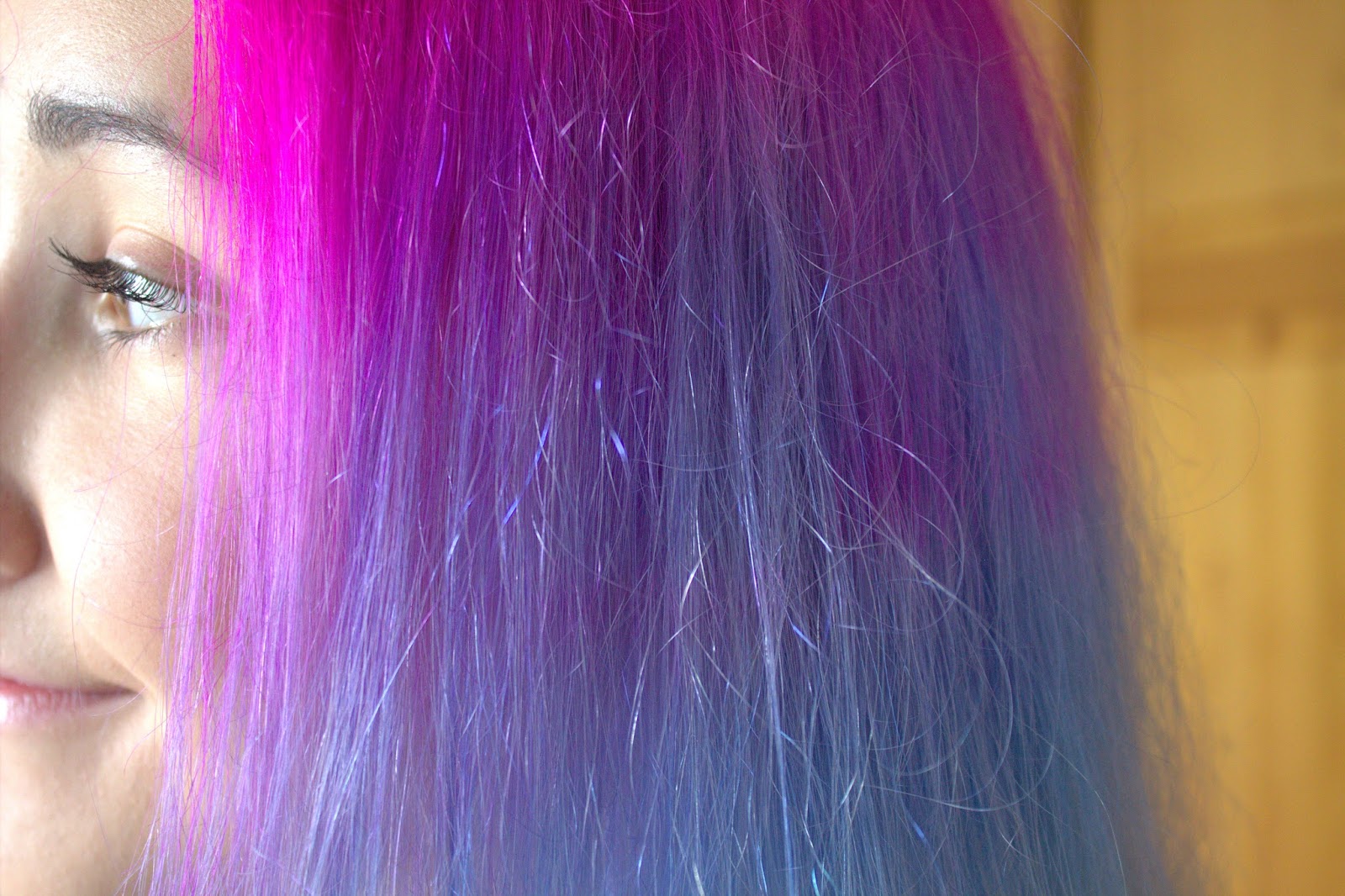 Najtrudniejszym momentem farbowania było nakładanie farbki numer dwa, gdyż była najciemniejszą i najbardziej napigmentowaną wśród tych, których jeszcze użyłam. Dodatkowo, musiałam rozprowadzić ją tak, aby zmieszała się z wyżej nałożonym odcieniem - różowym, utworzyła ładne przejście, z koloru do koloru i nie porobiła brzydkich plam. Najjaśniejszy niebieski był chyba najłatwiejszy do nałożenia, gdyż wystarczyło położyć go tylko na same końcówki i delikatnie pomieszać z ciemniejszym jego odcieniem, umiejscowionym wyżej.