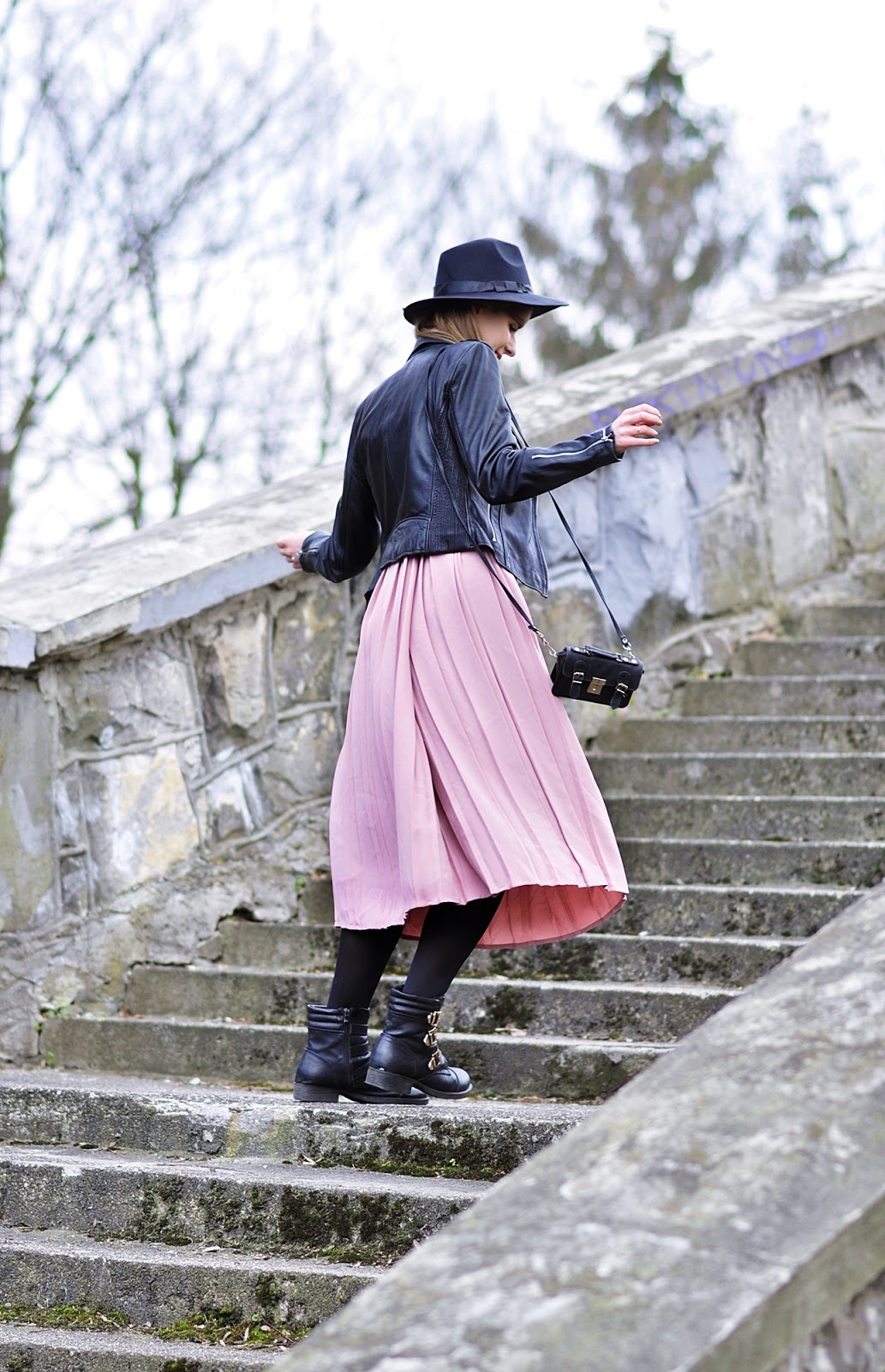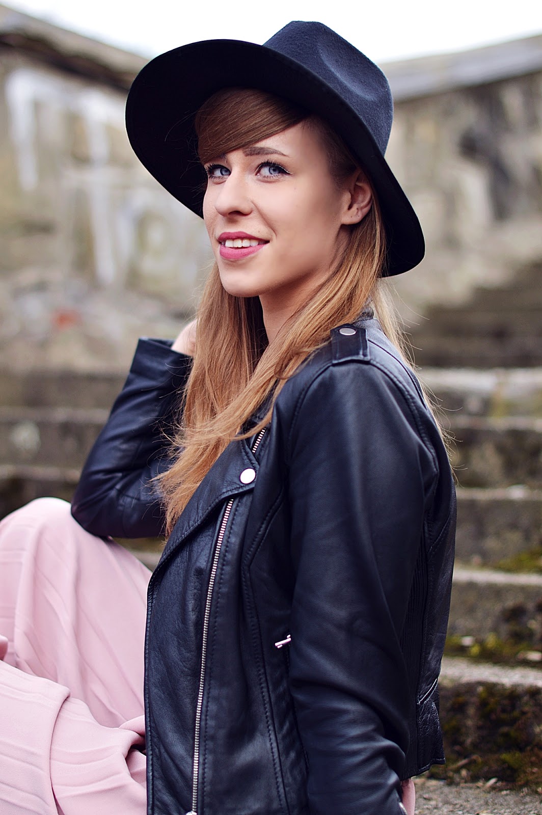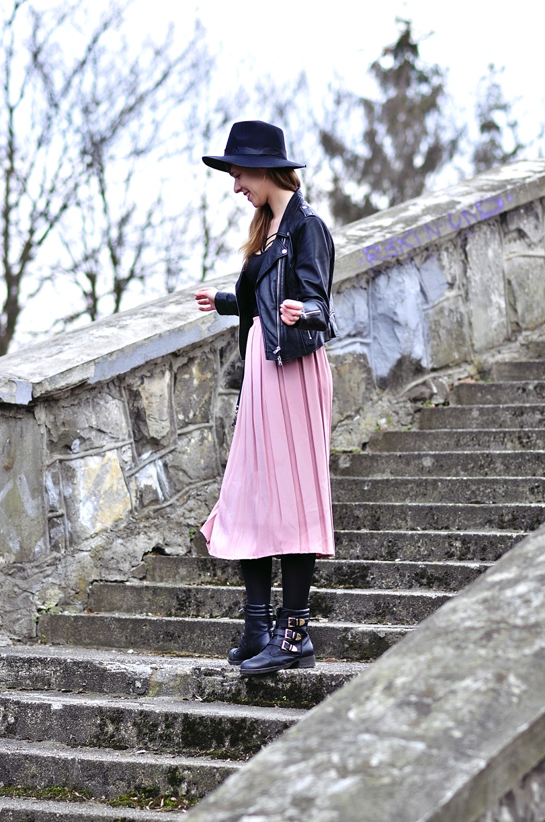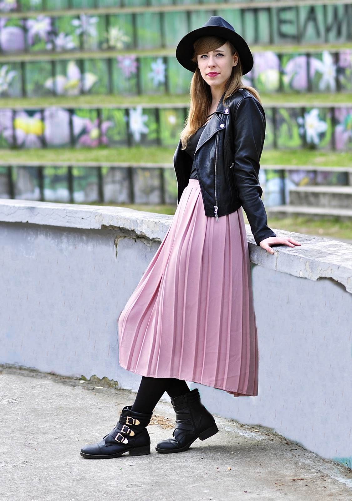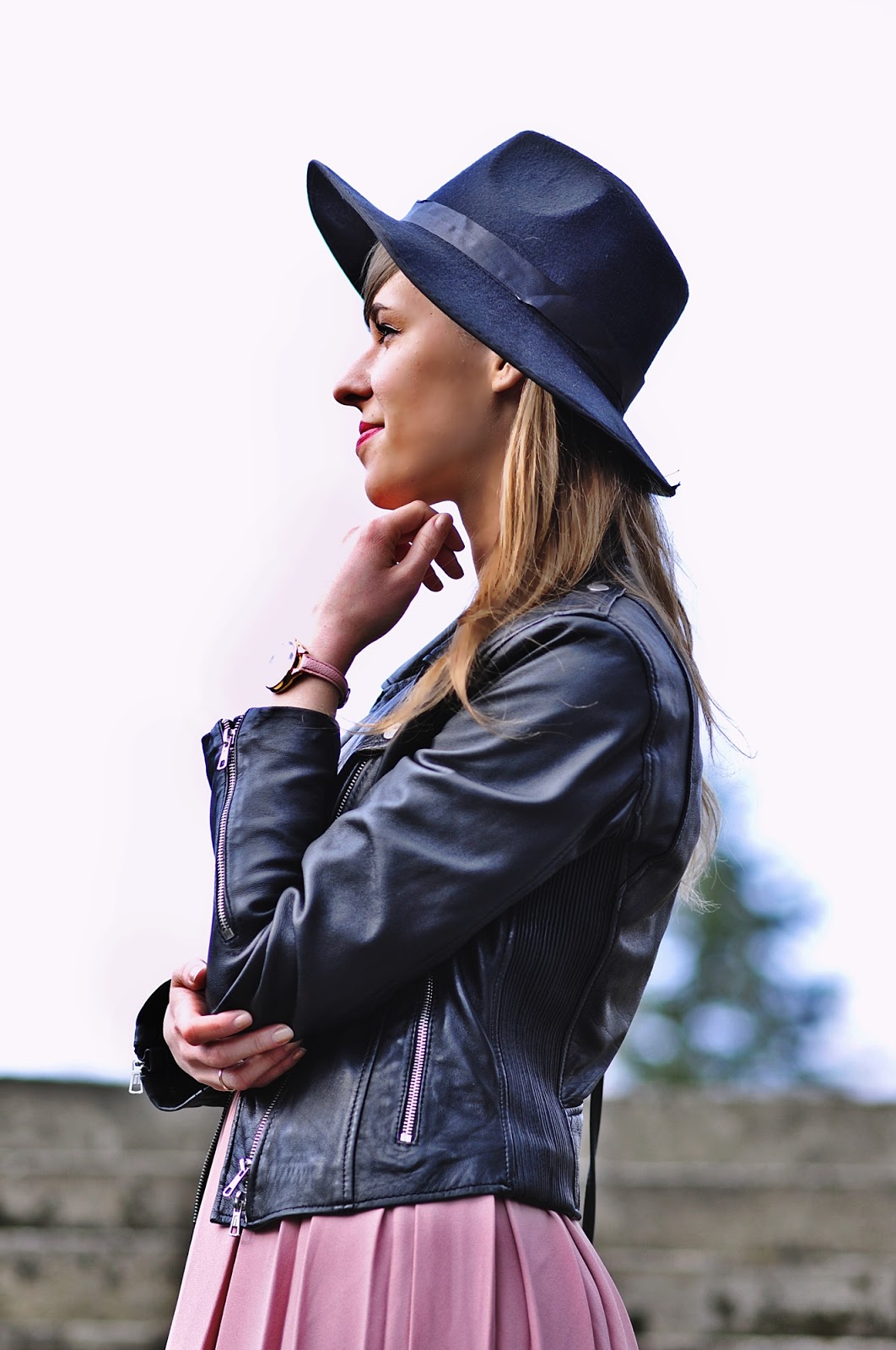 Początkowo, kiedy zastanawiałam się z czym ją zestawić, zamierzałam pójść w coś delikatnego i kobiecego - pastele, wysokie obcasy. Jednak na szczęście wpadłam na opcję, która znacznie bardziej do mnie pasuje. Takie glam rock'owe wydanie jest połączeniem elegancji i drapieżności. Z jednej strony pojawia się tu delikatna, pastelowa spódnica midi i kapelusz, z drugiej natomiast skórzana ramoneska, czerń i workery.