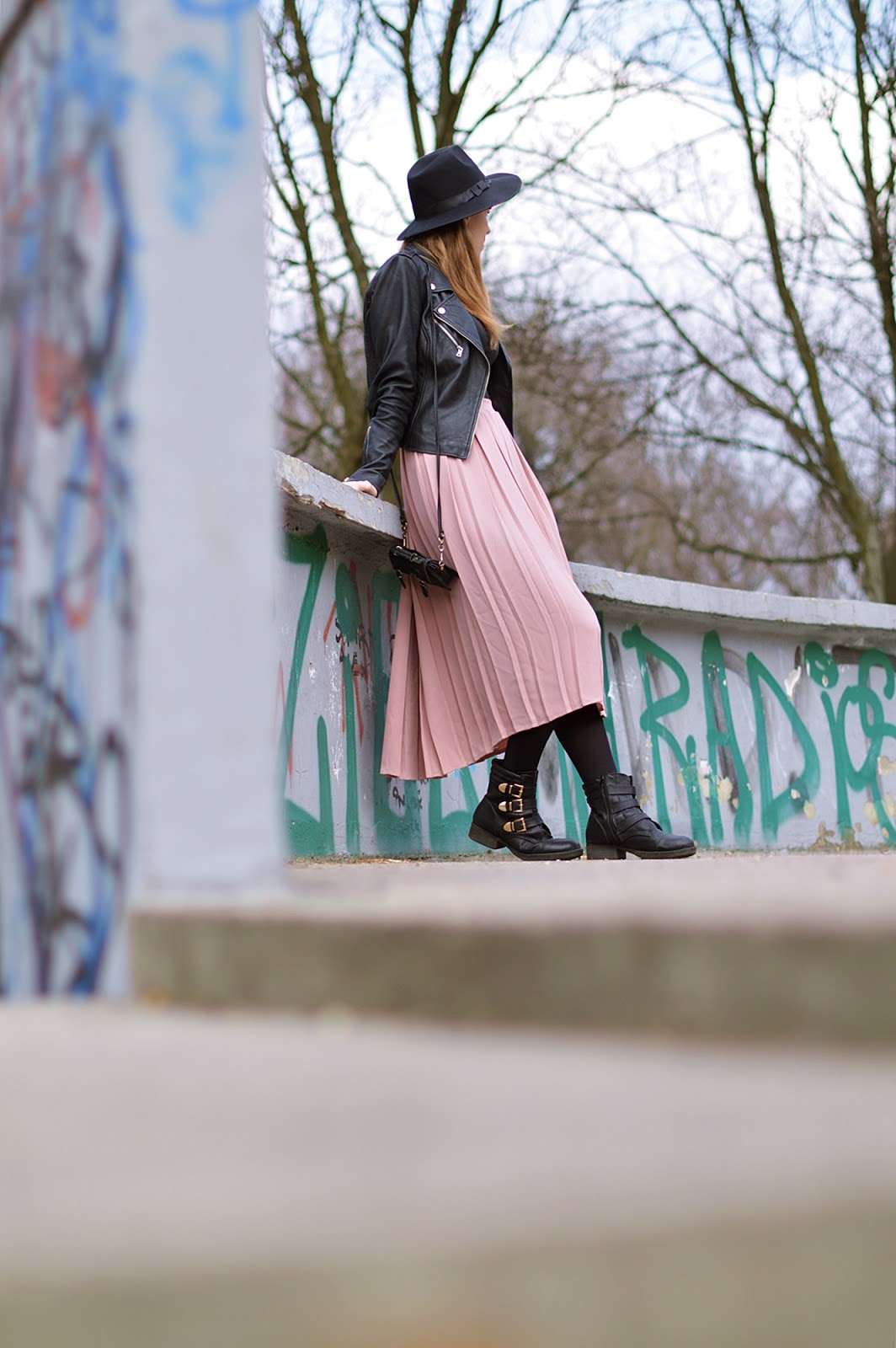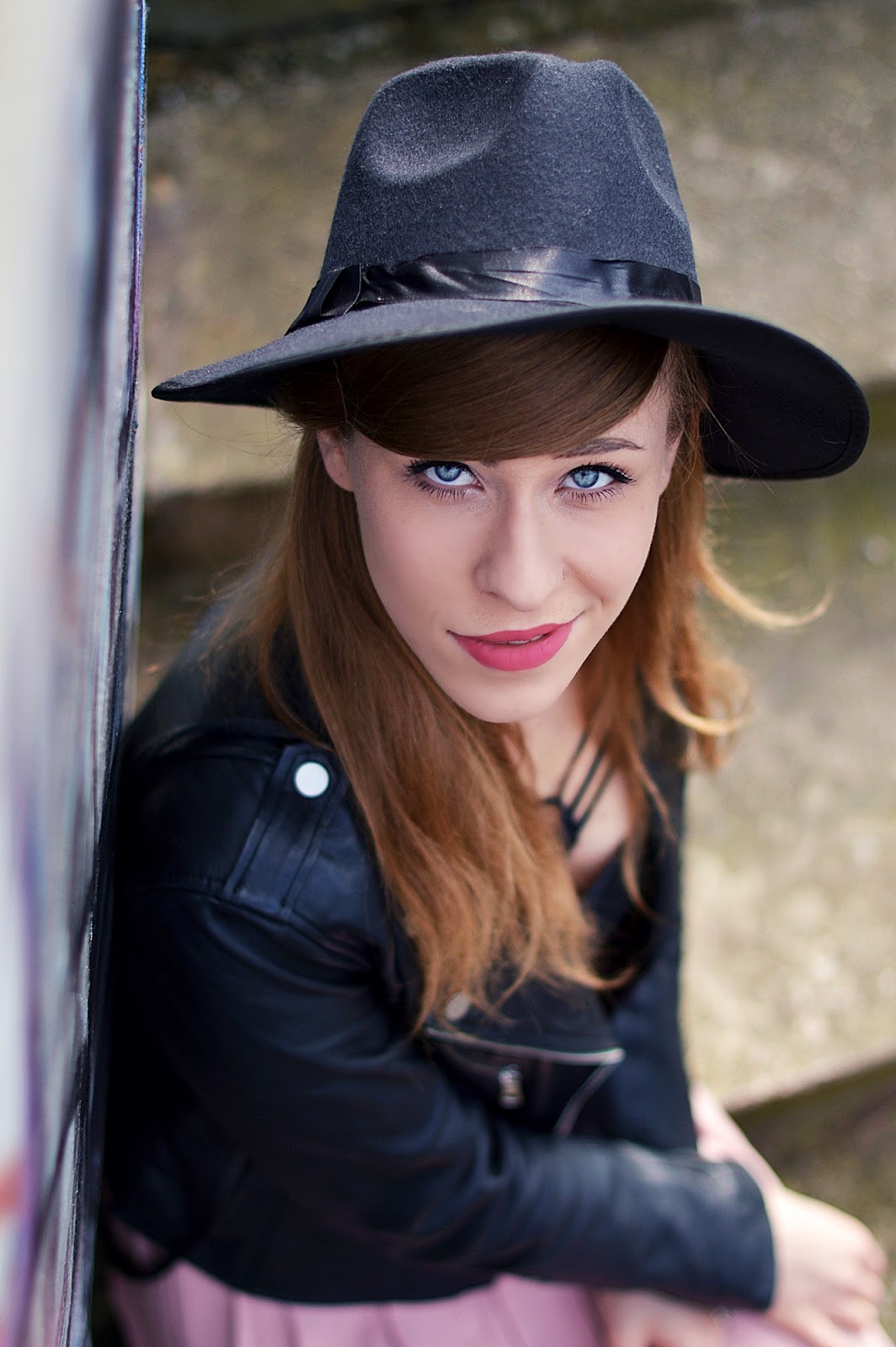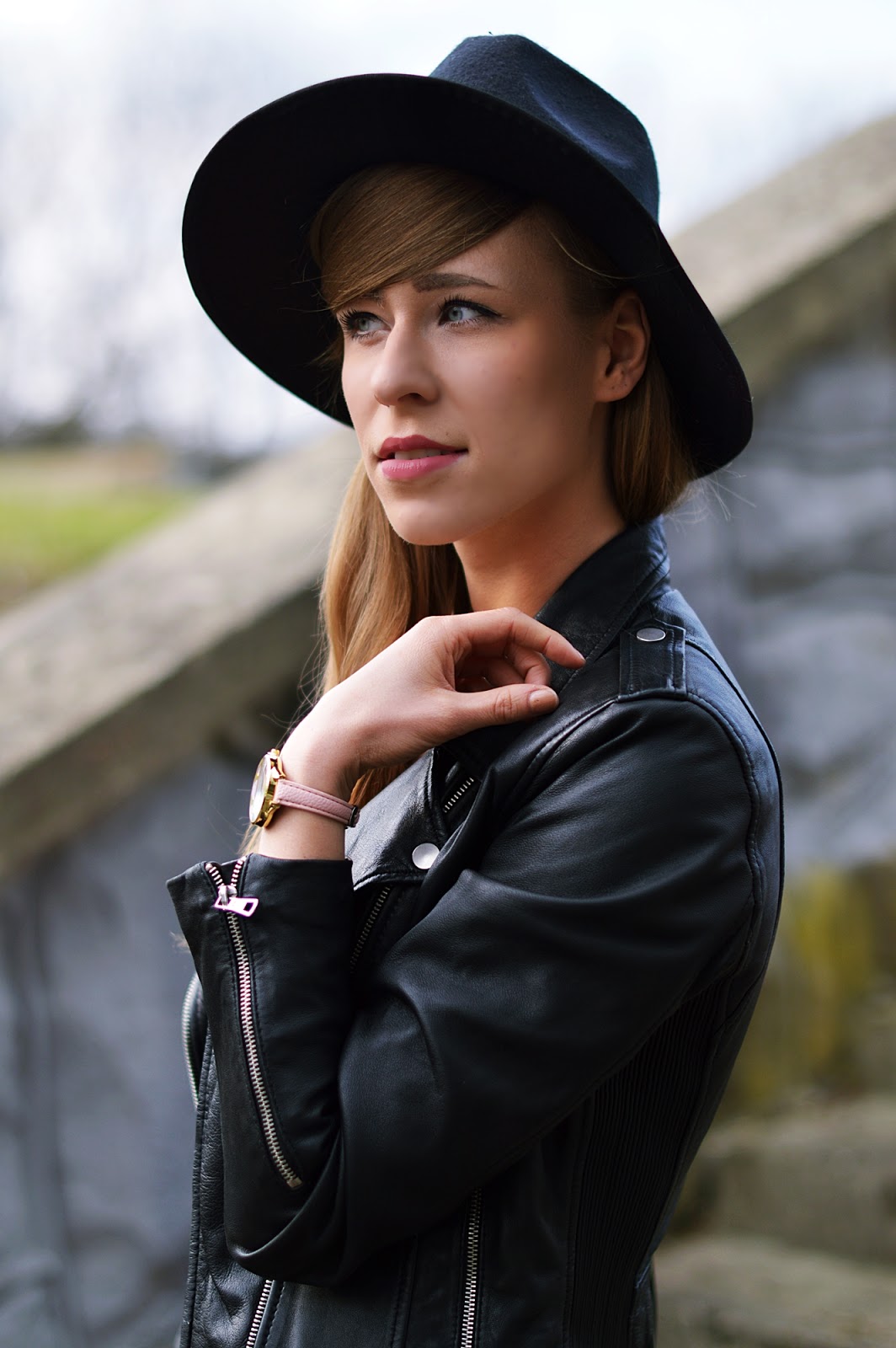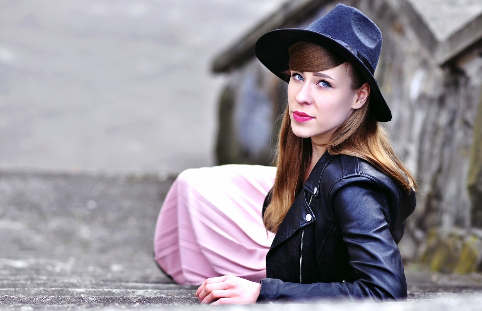 Początkowo, kiedy zastanawiałam się z czym ją zestawić, zamierzałam pójść w coś delikatnego i kobiecego - pastele, wysokie obcasy. Jednak na szczęście wpadłam na opcję, która znacznie bardziej do mnie pasuje. Takie glam rock'owe wydanie jest połączeniem elegancji i drapieżności. Z jednej strony pojawia się tu delikatna, pastelowa spódnica midi i kapelusz, z drugiej natomiast skórzana ramoneska, czerń i workery.