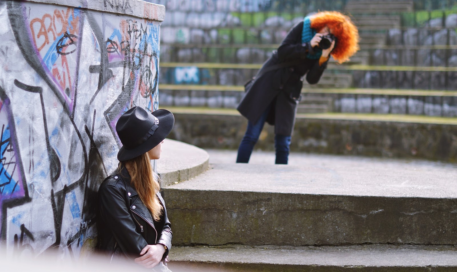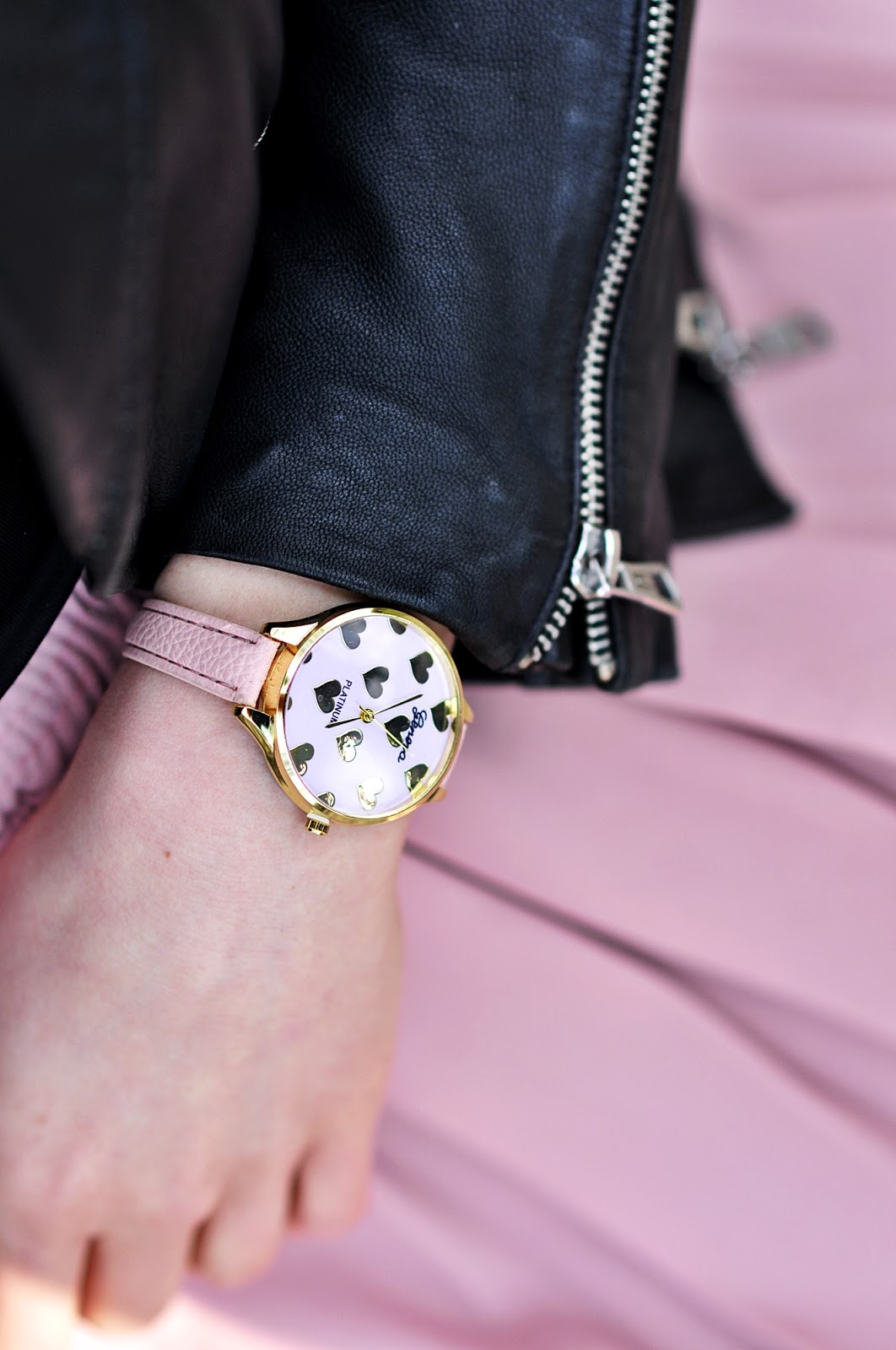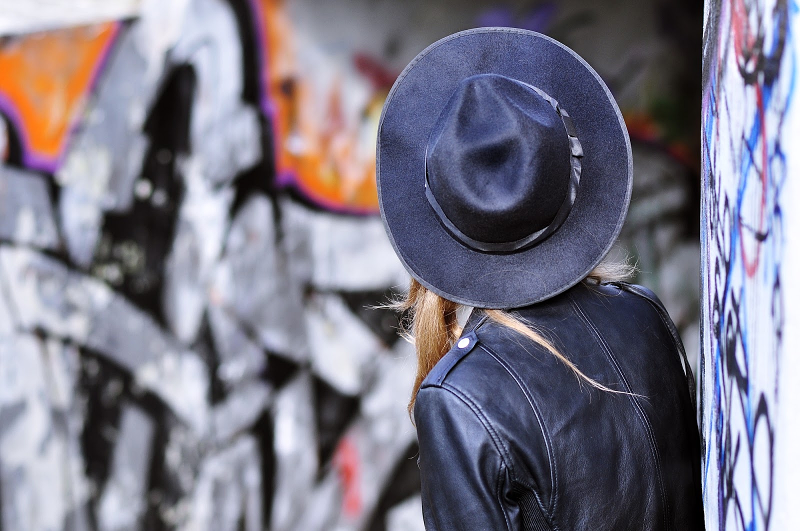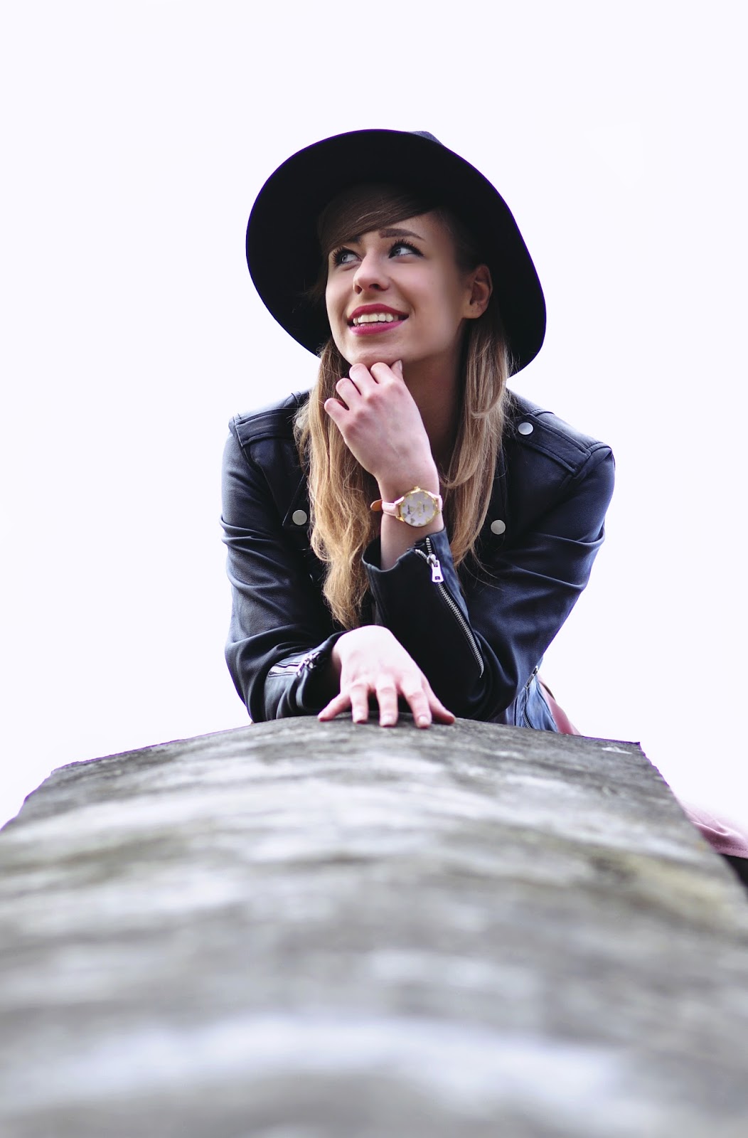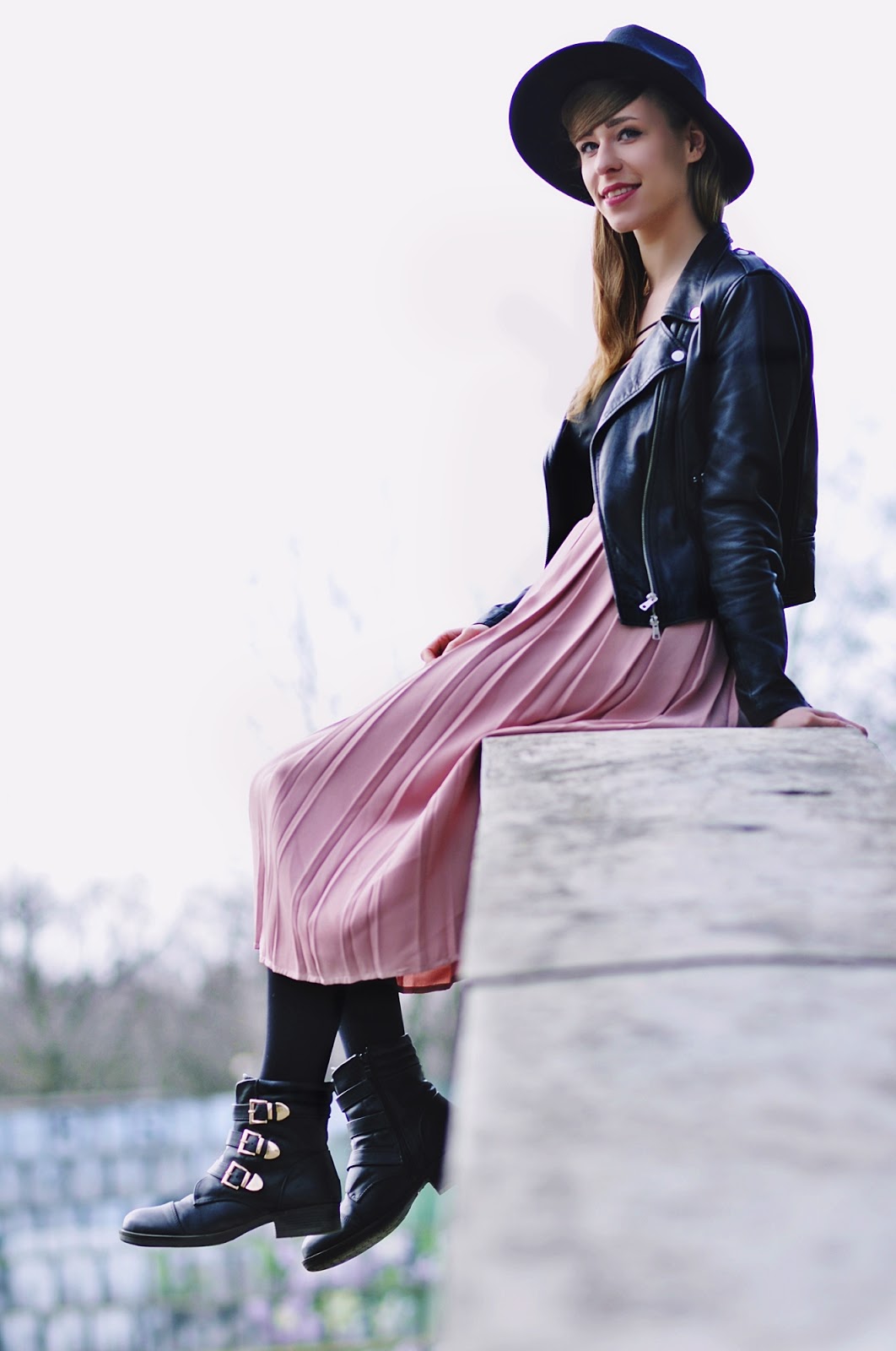 Początkowo, kiedy zastanawiałam się z czym ją zestawić, zamierzałam pójść w coś delikatnego i kobiecego - pastele, wysokie obcasy. Jednak na szczęście wpadłam na opcję, która znacznie bardziej do mnie pasuje. Takie glam rock'owe wydanie jest połączeniem elegancji i drapieżności. Z jednej strony pojawia się tu delikatna, pastelowa spódnica midi i kapelusz, z drugiej natomiast skórzana ramoneska, czerń i workery.