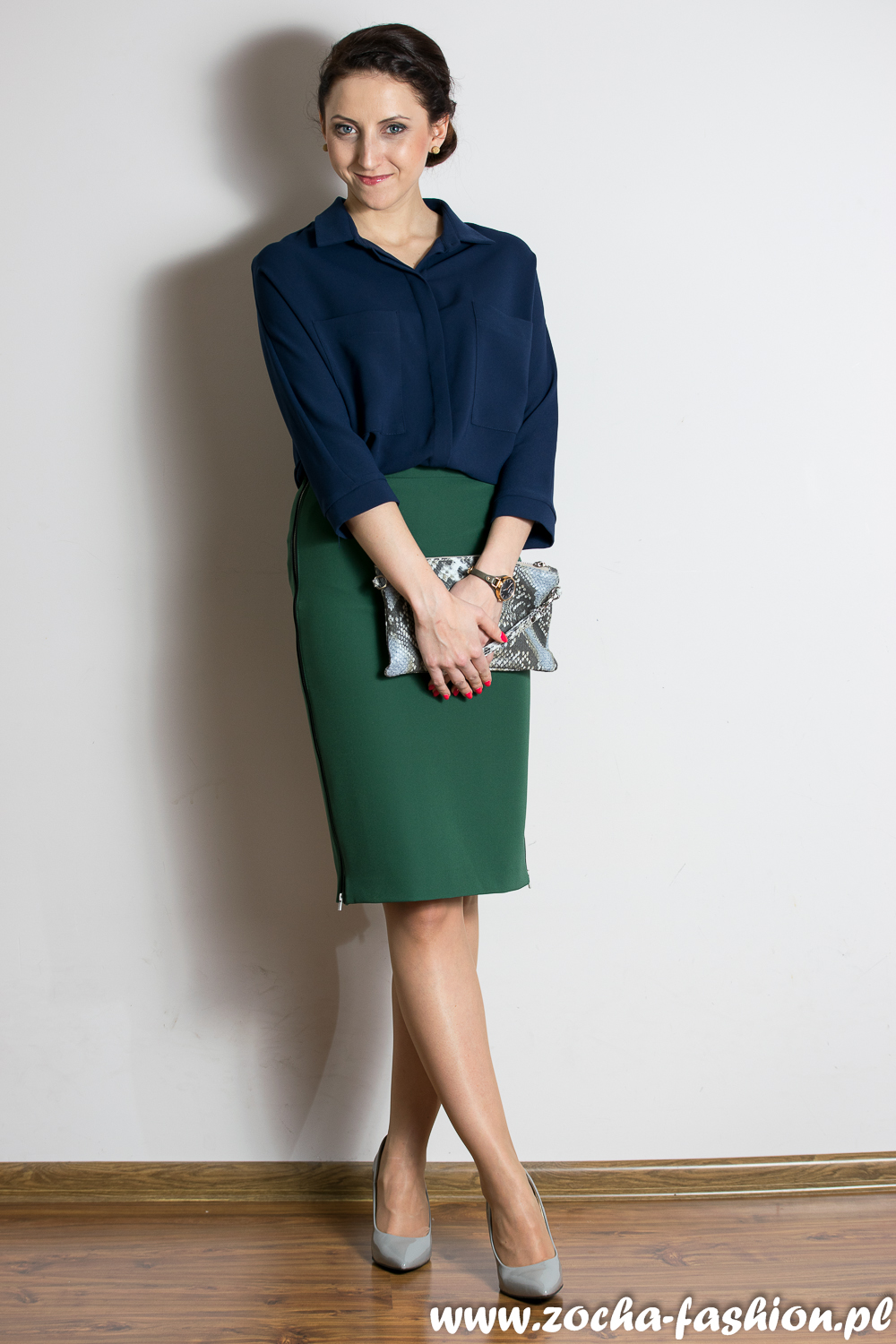 Zobacz oryginał pt., 25/03/2016 - 08:33Święta tuż, tuż. Pewnie większość z Was będzie spędzać ten czas w gronie rodzinnym. Ja również mam takie plany, dlatego uważam, że należy się na taką okazję stosownie ubrać. W moim mniemaniu to styl elegancki (ale nie do przesady;). Granatowa koszula, ołówkowa zielona spódnica z ozdobami w postaci szarych ekspresów na bokach, które idealnie uwydatniają i podkreślają sylwetkę. Do tego szare, klasyczne, lakierowane czółenka i torba kopertówka z wężowej skóry dopełniają cały zestaw. Moim zdanie zestaw będzie odpowiedni na taką okoliczność. A wy jak planujecie się ubrać na święta?
