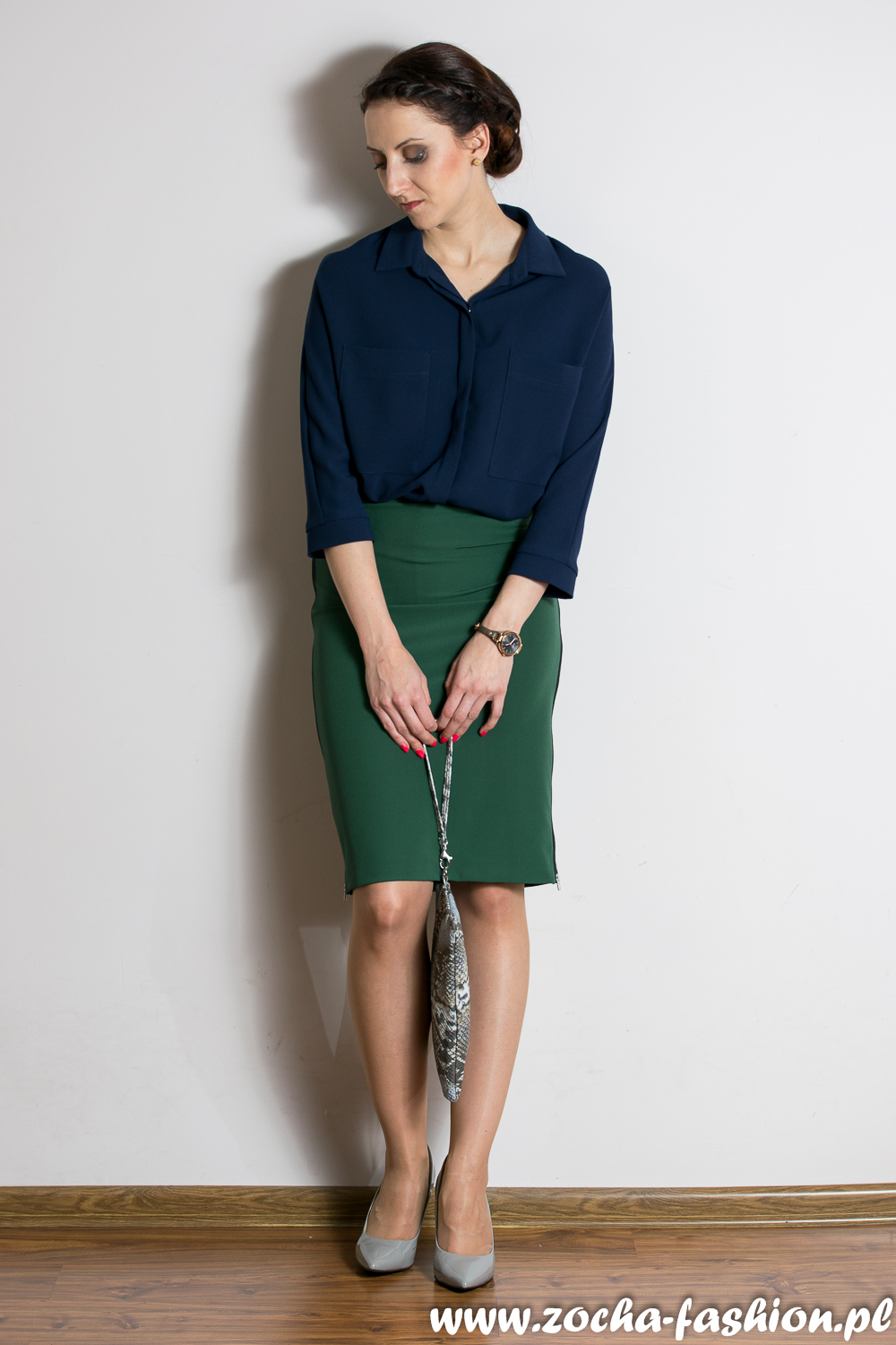 granatowa koszula, ołówkowa, zilona spódnica i wężowa skóra
