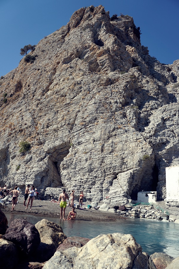 Kolejnym punktem zwiedzania były gorące źródła - Embros Therma. Woda wydobywająca się ze skalnej groty ma temperaturę 45-50oC i miesza się z chłodną wodą napływającą z morza. Bogata jest między innymi: w siarkę, potas, wapń, magnez i posiada właściwości lecznicze. W połowie XX wieku Włosi wywozili stąd sporo wody, mieszając ją z tą, ze źródeł z Rodosu. Gorące źródła są odgrodzone od morza kamieniami i w małym baseniku (nawet dla takiego zmarzlucha jak ja) woda aż parzyła. Najlepiej schować się za skały, gdzie wody ze źródła i morza intensywnie się mieszają - wówczas można delektować się kąpielą.