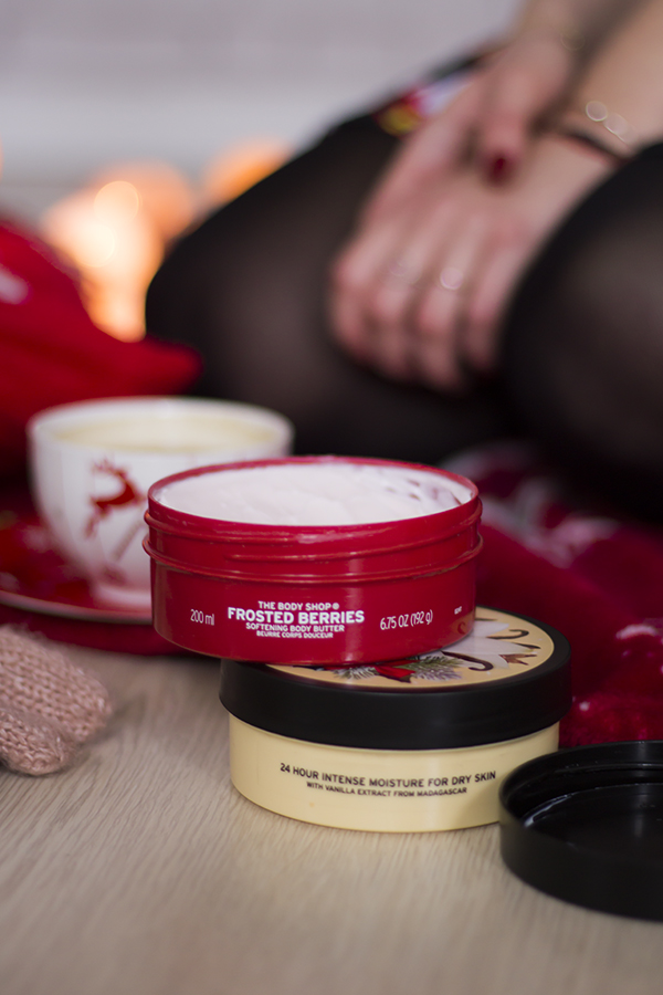 Firmy kosmetyczne nie pozostają w tyle. Marka The Body Shop w tym roku również wypuściła świąteczną linię. Masła do ciała od The Body Shop stosuję już od dłuższego czasu, dlatego nie mogłam nie wypróbować nowych zapachów. Urzekły mnie dwa, z trzech dostępnych. Pierwszy to mrożone jagody z żurawiną z Północnej Ameryki, a drugi to vanilla chai z ręcznie zbieraną wanilią z Madagaskaru, z nutką cynamonu, kardamonu i brązowego cukru.