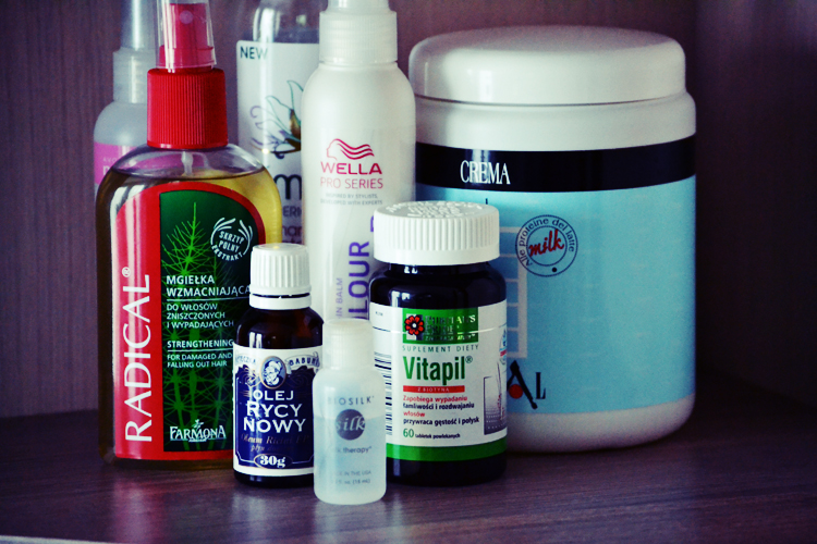 Jeżeli chodzi o resztę produktów to maskę z Cremy stosuję co najmniej raz w tygodniu. Wygładza ona włosy i nadaje nieziemski zapach, który według mnie ma mleczny zapach. Olejek rycynowy stosuję raz na jakiś czas. Łączę go z sokiem z cytryny i troszkę podgrzewam w mikrofalówce. Taką miksturę nakładam na całą długość włosów i trzymam 30 min. Po tym czasie dokładnie myję włosy. Kapsułki Vitapil stosowałam jakiś czas temu, niestety musiałam przerwać, ponieważ musiałam brać inne witaminy, które by się powielały. Nie zauważyłam drastycznych zmian w kondycji moich włosów, ale może to być spowodowane tym, że brałam go za krótko. Jedwab do włosów używam dwa razy w tygodniu. Nie mam potrzeby używania go częściej.