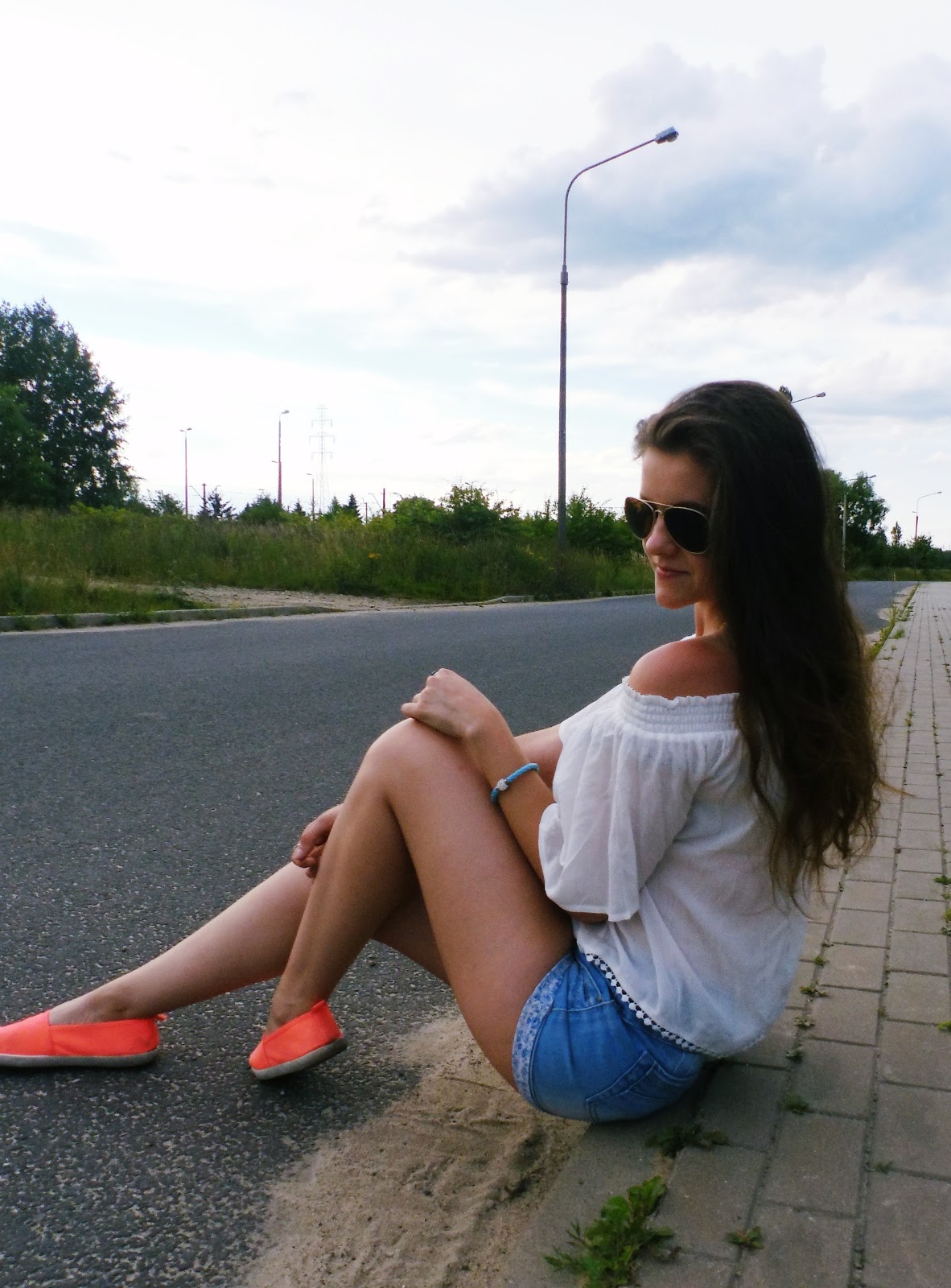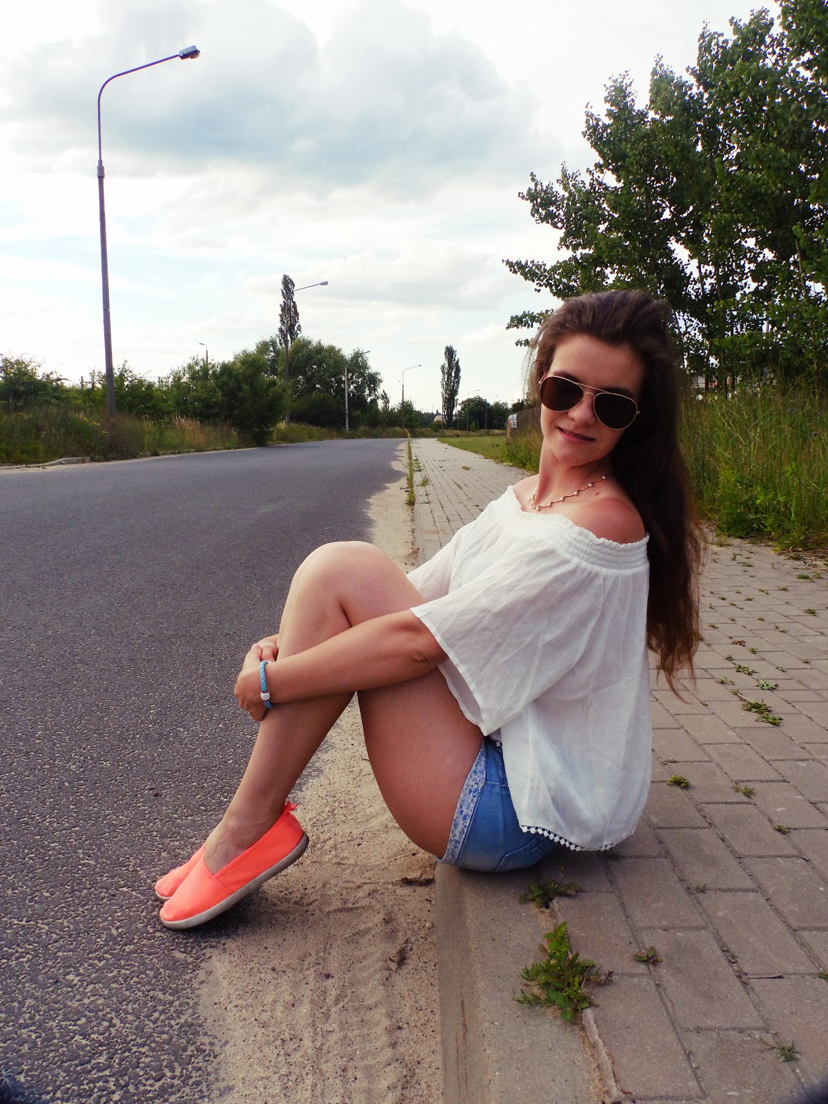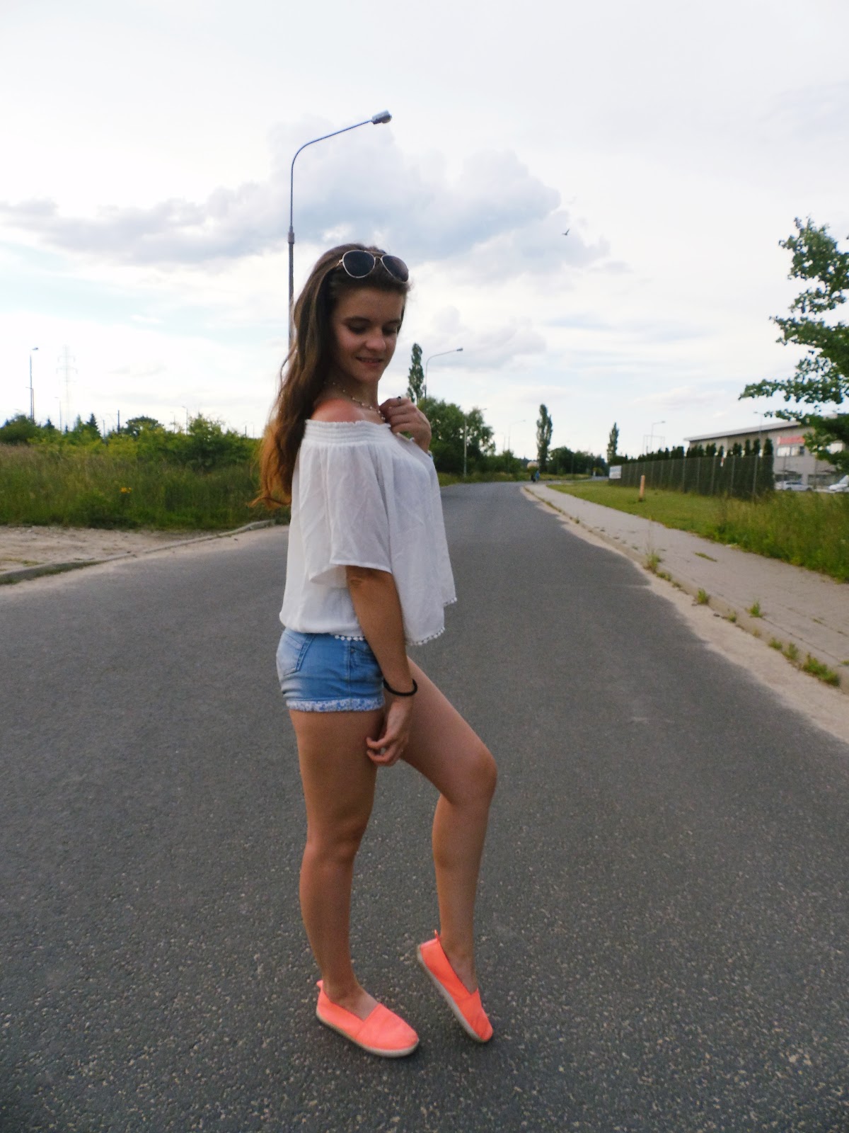 Stylizacja idealna na wakacyjną porę :) Hiszpanka - pokochali ją chyba wszyscy, ja również. Zdecydowany hit tego lata. Must have w twojej szafie :) Do bluzeczki dobrałam dżinsowe spodenki z delikatnym motywem kwiatowym. Muszę się przyznać że mam je już od 4 lat hihi, i nadal się w nie mieszczę :) Neonowe butki, mogliście już je zobaczyć w jednym z poprzednich postów.