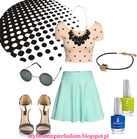 Rozkloszowana miętowa spódnica + krótki, beżowy t-shirt. Czarne sandałki na wysokich szpilkach a jako dodatki: duży naszyjnik, delikatna bransoletka i lenonki. Zestaw jest w kolorach pastelowych, więc bardzo ładnie podkreśla opaleniznę.