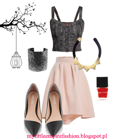 Rozkloszowana spódnica w kolorze pudrowego różu + czarny, dżinsowy top. Asymetryczne szpilki w czarnym kolorze a jako dodatki: gruba bransoletka o ciekawej fakturze i złoto-czarny naszyjnik, który dodaje odrobiny pazura tej delikatnej stylizacji.