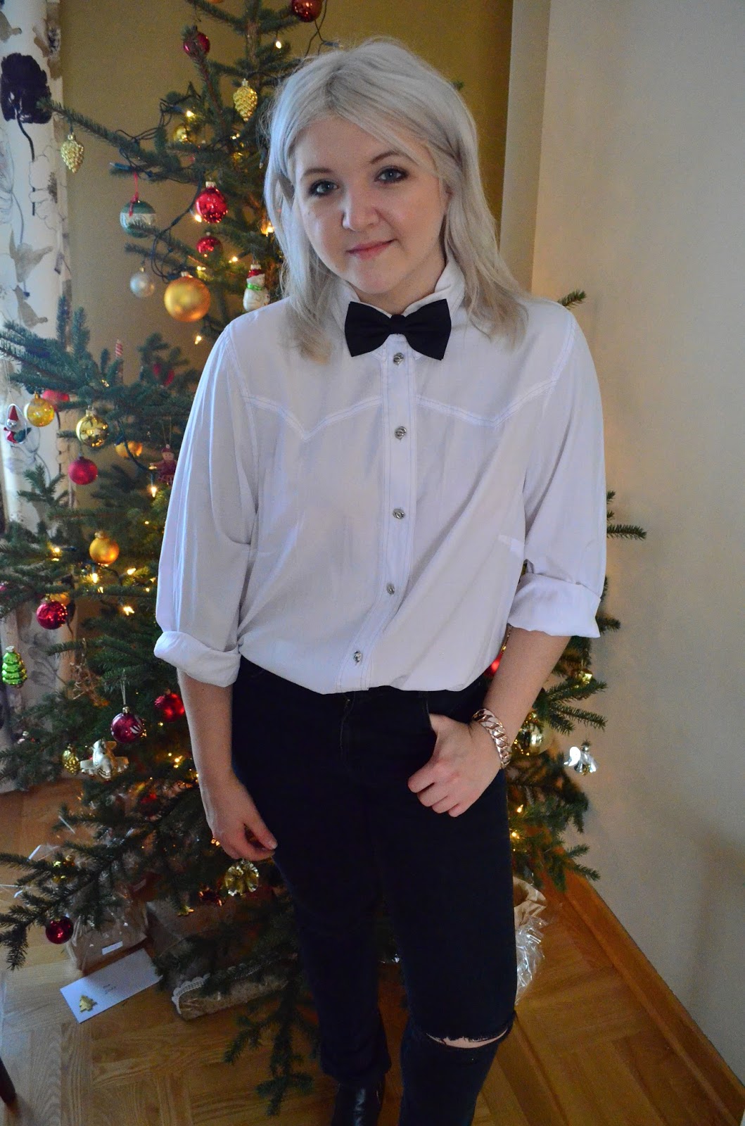 Jeśli zupełnie chcemy wyjść z tematu sukienek, spódniczek i bardzo dziewczęcych akcentów, polecam koszulę! Postawiłam na białą, klasyczną, jednak dodałam podarte spodnie, mocną, wyraźną bransoletkę oraz ulubioną muszkę dzięki czemu stój stał się trochę rockowy jednak pozostał elegancki!