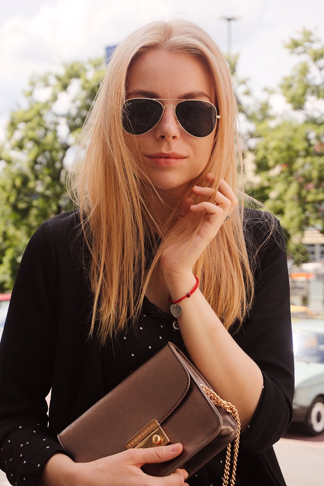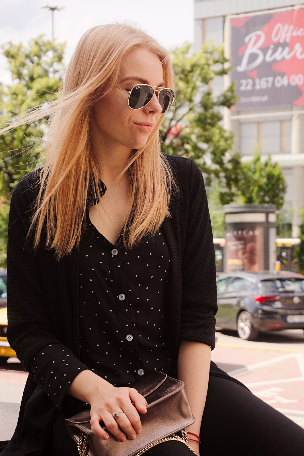 Wyjście do kina czy teatru powinno posiadać odpowiednią oprawę. Twój strój powinien być dopasowany do okoliczności. Jeśli wybierasz się latem do teatru lub randkę, odpowiednie z pewnością będą spodnie o formie cygaretek. Moje zostały wykonane z lekkiej i cienkiej bawełny, dlatego tak dobrze sprawdzają się latem. Luźna koszula w drobne, białe kropeczki staje się ciekawym urozmaiceniem całej stylizacji. Moja długa marynarka została wykonana z poliestru, cały materiał został wytłoczony w ciekawy wzór. Rękaw o długości 3/4 jest strzałem w dziesiątkę, jeśli chodzi o letnie stylizacje.