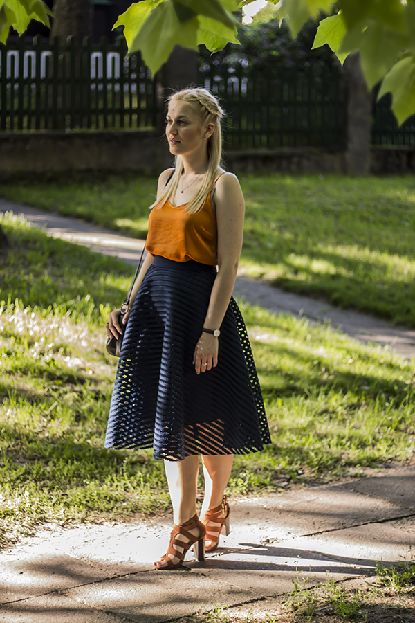 W poprzednim poście mogliście zobaczyć przykład mojej stylizacji na przyjęcie weselne [tutaj]. Dzisiaj chciałam Wam zaprezentować strój, który miałam na sobie podczas poprawin. Poprawiny odbywają się czasami w sali weselnej, innym razem w domu Pary Młodej. Może to być również forma grilla w ogrodzie, jeśli pogoda dopisze. Nasz strój zatem powinien być uzależniony od miejsca oraz rodzaju przyjęcia. Wskazane jest jednak, żeby ubiór podczas poprawin był elegancki, ponieważ w ten sposób podkreślimy wagę tego dnia dla Pary Młodej. Najlepszy, moim zdaniem, wybór to casualowe sukienki, spódnice czy garnitury. Ja wybrałam granatową spódnicę i pomarańczową koszulkę, dodając do całości wygodne sandały na słupku.