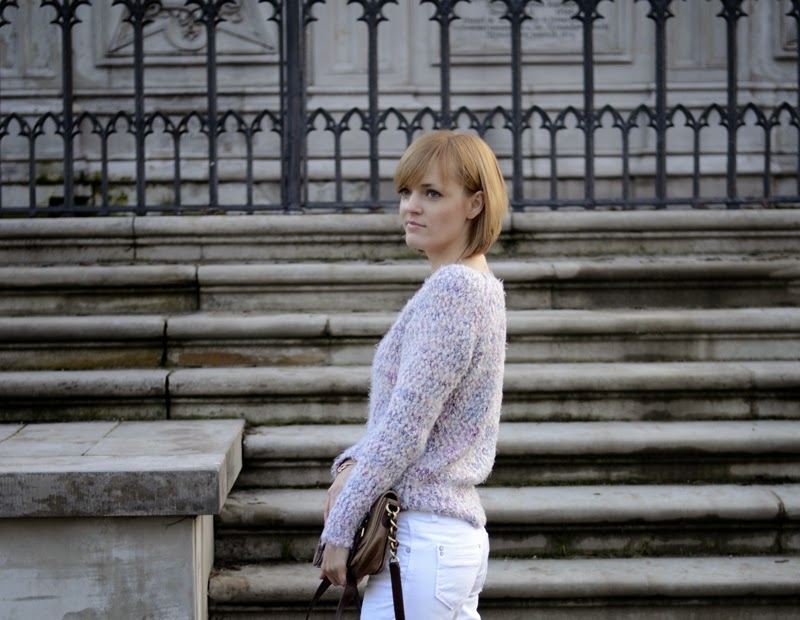Bardzo lubię takie połączenie delikatnych barw z bielą :-) Daje to lekki i romantyczny look, a mocniejszy akcent jakim jest ciemniejsza torebka równoważy całość :-) Do tej pory najczęściej wykorzystywałam kombinacje różnych kolorów z czernią, ale przecież nie zawsze musi być ona podstawą :-)