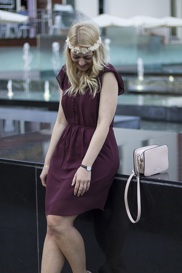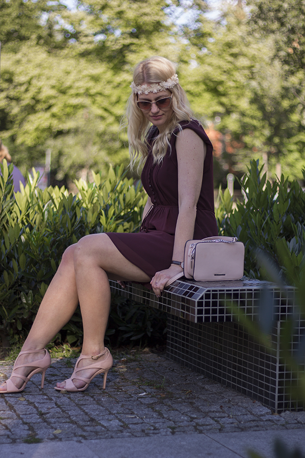 Miniona sobota zaowocowała dwiema różnymi imprezami, w których miałam przyjemność uczestniczyć. O 15 ślub koleżanki, a o 17 piknikowe spotkanie ze znajomymi nad brzegiem jeziora. Oczywiście z powodu napiętego terminarza nie było mowy o zmianie stroju i przebraniu się. Z uwagi na fakt, że jestem osobą praktyczną musiałam wybrać strój, który będzie pasował do obu okazji. Tego dnia moją bazą była bordowa sukienka. Na ślub dobrałam do niej sandałki na szpilce w cielistym kolorze oraz torebkę w kolorze pudrowego różu.