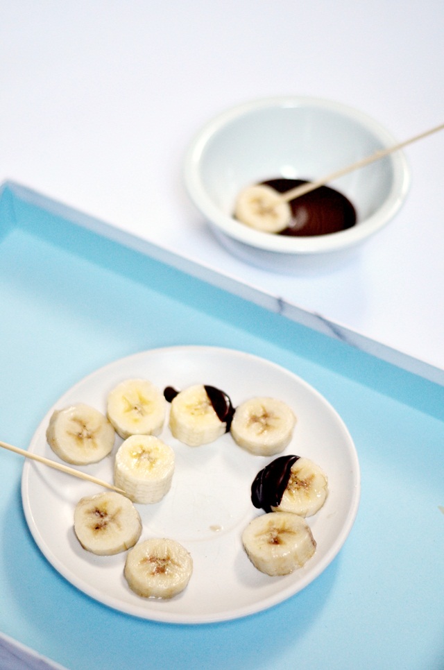 Zanurzaj plasterki ulubionego owocu/ owoców w roztopionej mieszaninie przy pomocy widelca i wykładaj je na przygotowaną wcześniej tackę.
