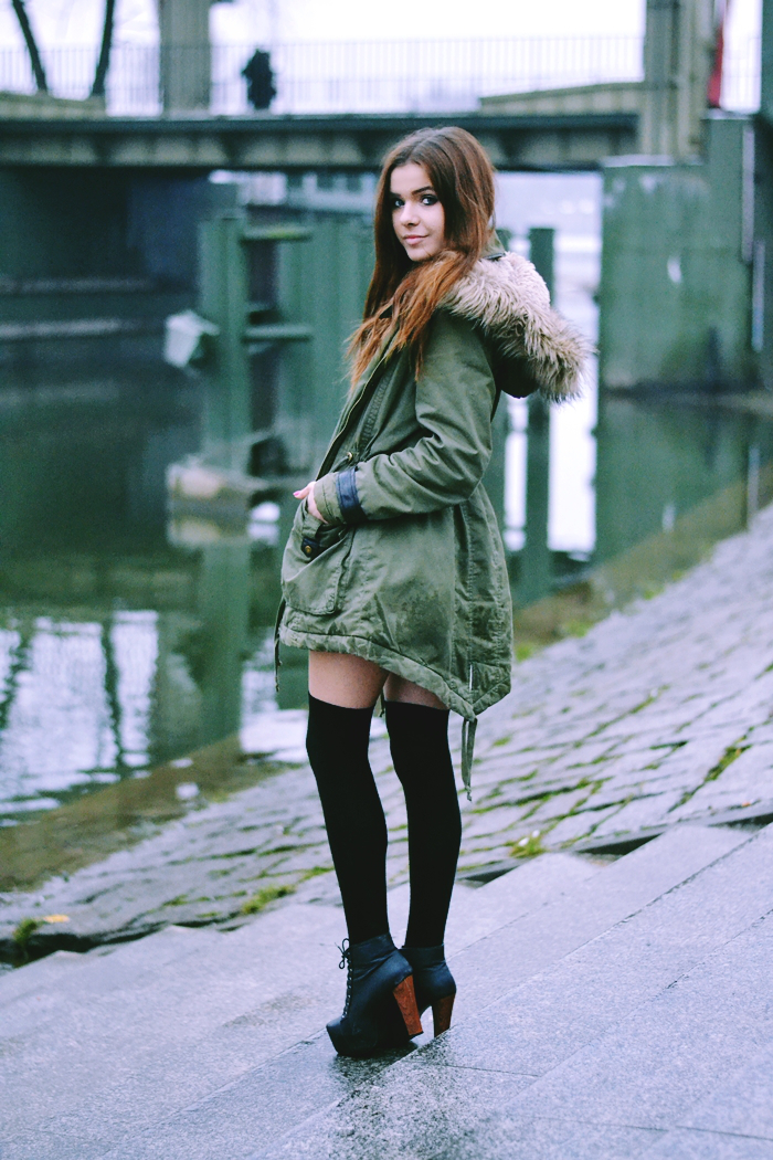 Zobacz oryginał ndz., 01/02/2015 - 10:57Cześć wszystkim! Mamy niedziele, a co za tym idzie? Czas wolny, który postanowiłyśmy poświęcić blogu. Stylizacja, którą dla was przygotowałam, nie jest specjalnie skomplikowana. Mimo tego wciąż elegancka. Zależało mi przede wszystkim na tym, aby pokazać wam śliczną parkę, w kolorze khaki, którą ostatnio dorwałam w second handzie. Tego typu kurteczki już dawno opanowały styl miejski, dlatego bardzo często można się z nimi spotkać na ulicach. Uwielbiam złote dodatki, dlatego też, bez blaszkowego paska, stylizacja by się nie obeszła. Wydaje mi się, że w czarnych rajstopach strój sprawiałby wrażenie zbyt nudnego i monotonnego, dlatego też postawiłam na zakolanówki, które idealnie sprawdziły się w tej roli . A wy co myślicie o stylizacji? Zostawcie po sobie komentarz. A tymczasem życzę wam przyjemnej niedzieli, odpoczywajcie kochani moi - puki jeszcze weekend trwa :)
