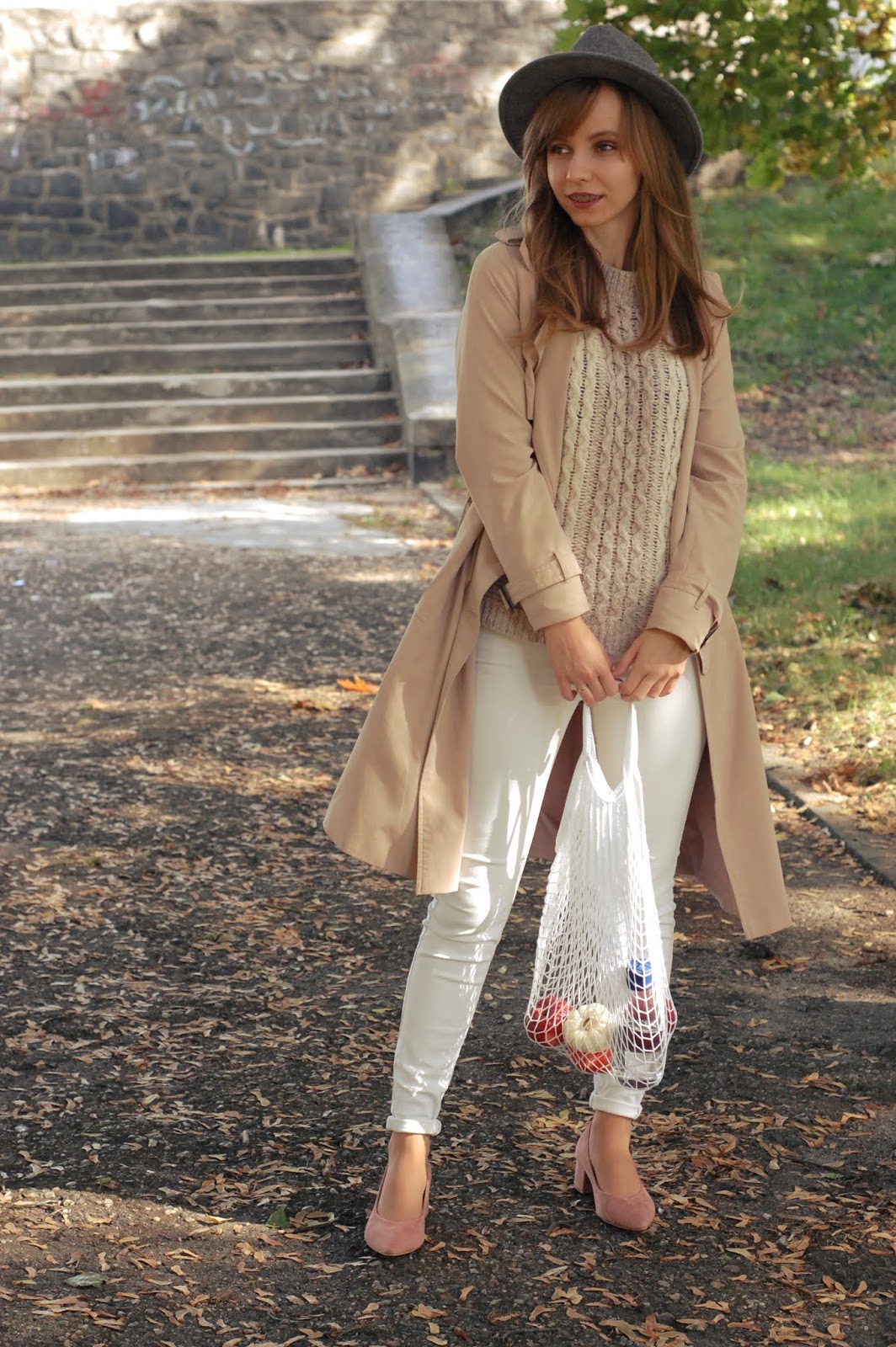 Jesiennym MUST HAVE dla mnie jest oczywiście klasyczny trencz, który dzięki swojej prostocie idealnie pasuje zarówno do eleganckich jak i codziennych zestawów. Jego beżowy kolor będzie świetną bazą zarówno do stonowanych jak i bardziej odważnych stylizacji. Dzisiaj zdecydowałam się jednak na prosty, neutralny look. Niezbędnym elementem każdej jesiennej stylizacji jest ciepły sweter. Mój beżowo-kremowy kolorem wpasuje się zarówno do płaszcza jak i białych spodni. Kroplą koloru są zdecydowanie pudrowe czółenka. Szczerze mówiąc ten model od GEMRE to jedne z najwygodniejszych, eleganckich butów w mojej szafie. Zapewne to sprawka stabilnego, niewysokiego obcasa na słupku. Nie mogło również zabraknąć mojego ulubionego dodatku czyli kapelusza, tym razem w szarym kolorze.
