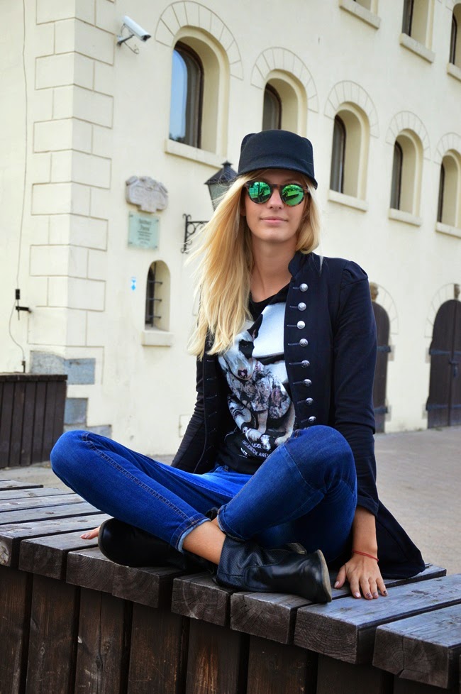 Zobacz oryginał pt., 05/09/2014 - 07:39Witam Was po dluzszej przerwie. Od kilku dni mamy wrzesien, ale na szczescie możemy cieszyc sie nadal piekna, sloneczna pogoda. Dzisiaj prezentuje Wam proste zestawienie- jeansy, czarne botki, marynarka, czapka oraz dodatki w lampardzie cetki. W glownej roli wystepuje dzis nakrycie głowy jakim jest czapka z uszami, która pochodzi z tegorocznej kolekcji House. Skórzana torebka ze zwierzęcym wzorem stała sie moja ulubiona na sezon jesienno zimowy. Jak mozna zauwazyc powoli wyciągam z dna szaf jesienna garderobe oraz zaopatruje się w nowe ubrania na nowy sezon. Dominujacym motywem tej jesieni będzie dla mnie krata, cetki oraz azteckie wzory. Bede starala sie, by wpisy byly zroznicowane i ciekawe, chcialabym pokazac Wam wiele motywow, ktore bede laczyc ze soba.