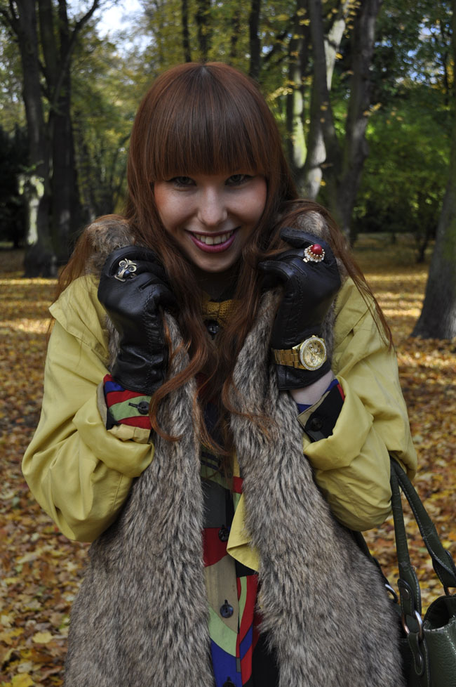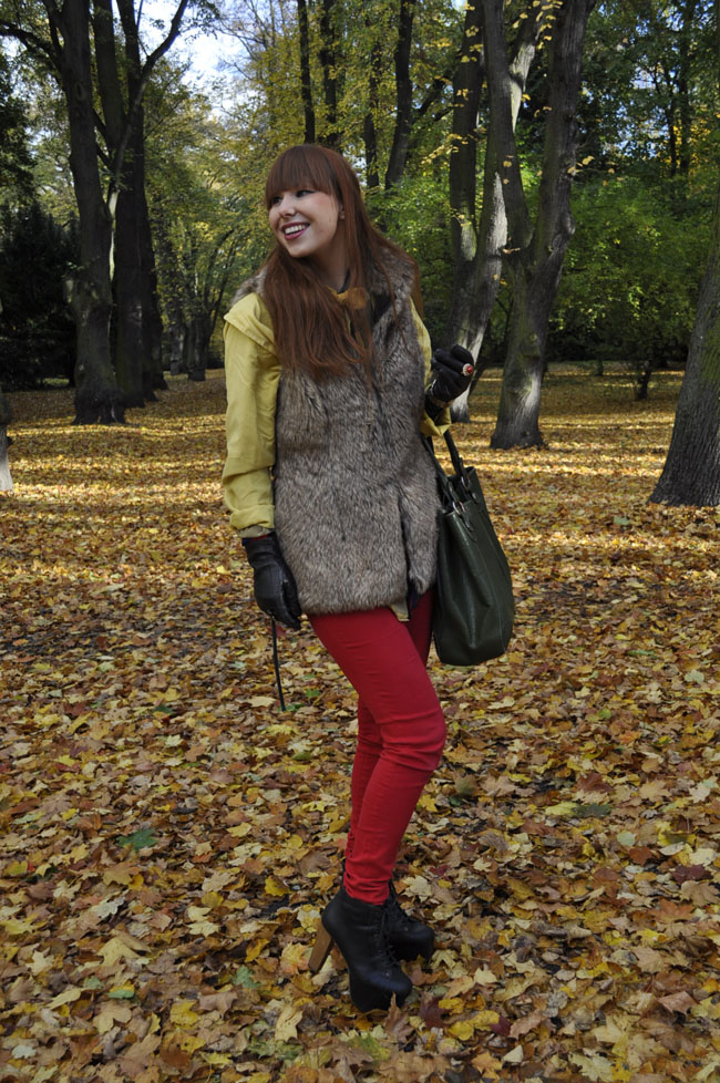 Zdecydowanie zamiast bordowych wybieram soczyście czerwone spodnie, które mieliście już okazję widzieć na blogu w stylizacji monocolor. Do nich lumpeksowa koszula, której wzór urzekł mnie od pierwszego wejrzenia. Moja żółta kurtałka w idealnym połączeniu z futerkiem i mucha Atomka zrobiona własnoręcznie przez Mamcika;) Nie było innej możliwości- miejsce na stopach musiały zająć Lity;)