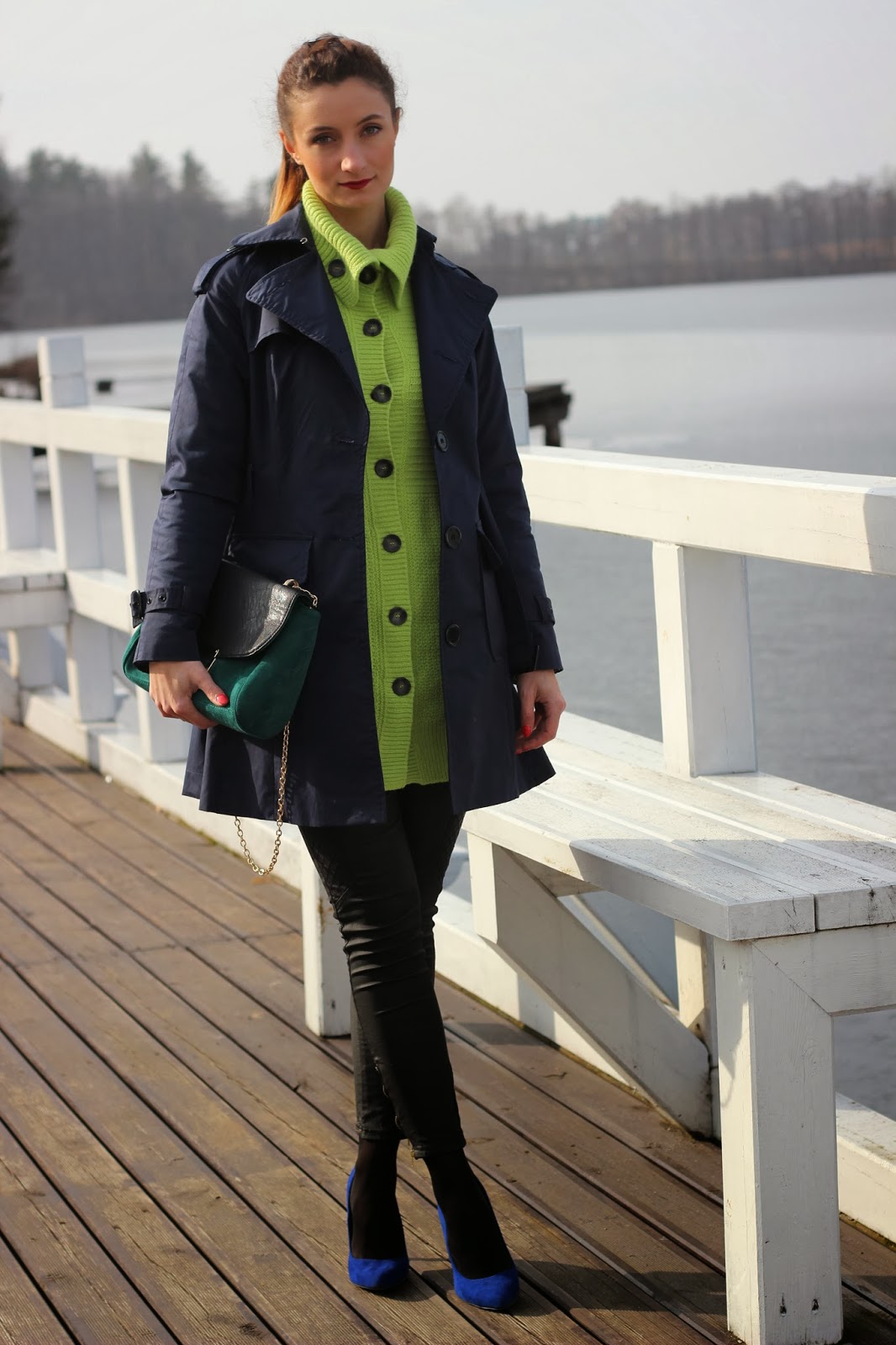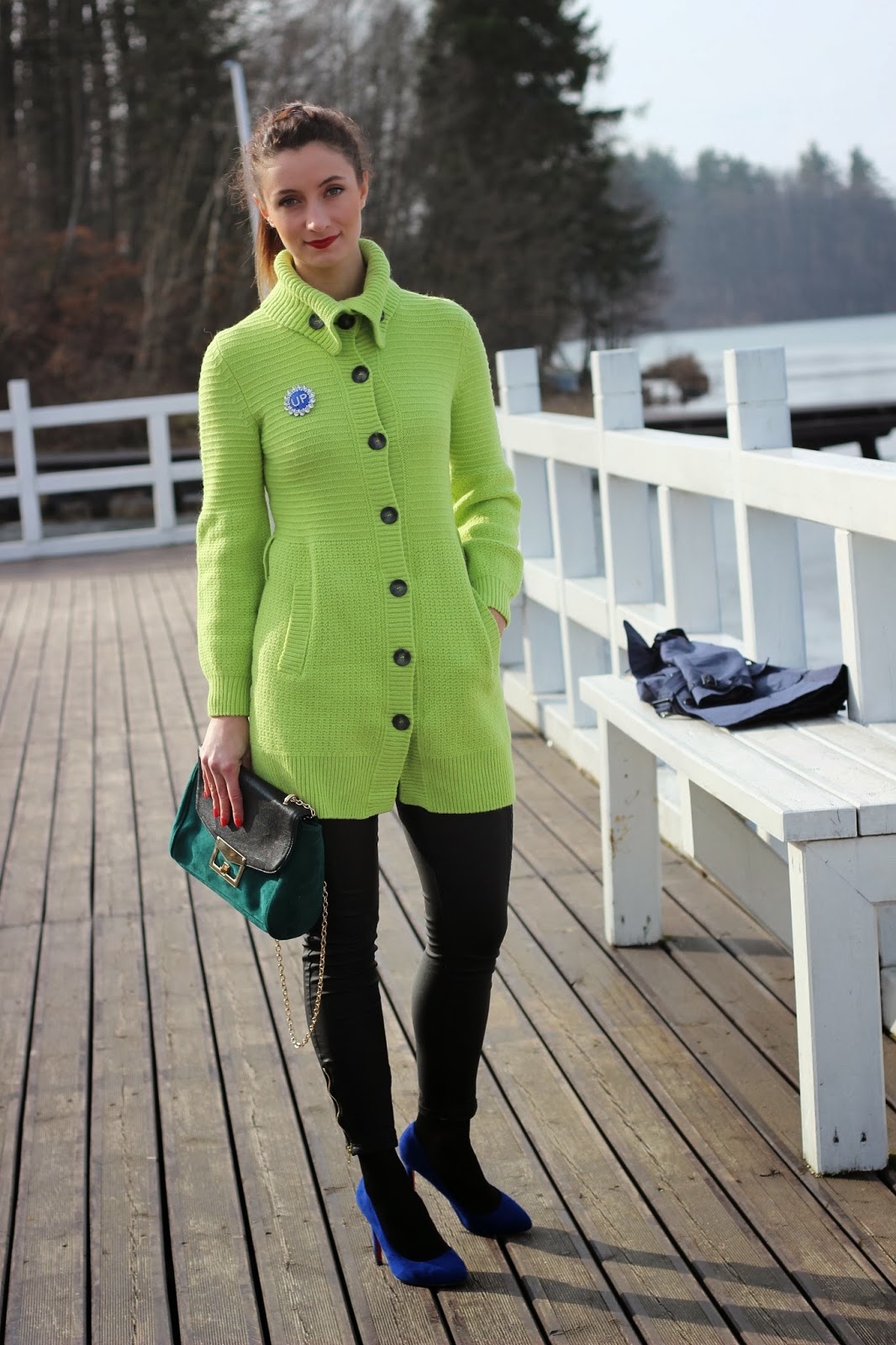 Płaszcz i spodnie- no name, Sweterek- Marc Cain, Buty- Bershka, Torebka- Mohito, Broszka- New Yorker