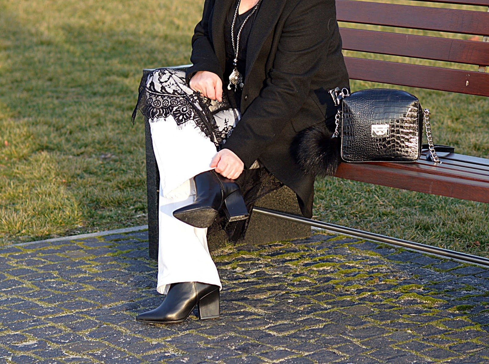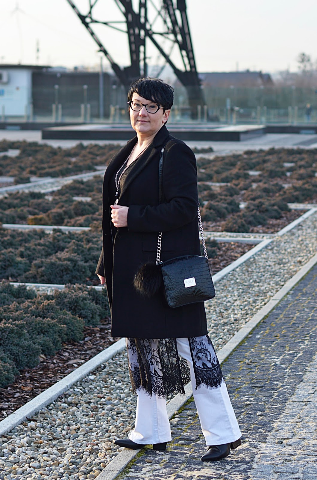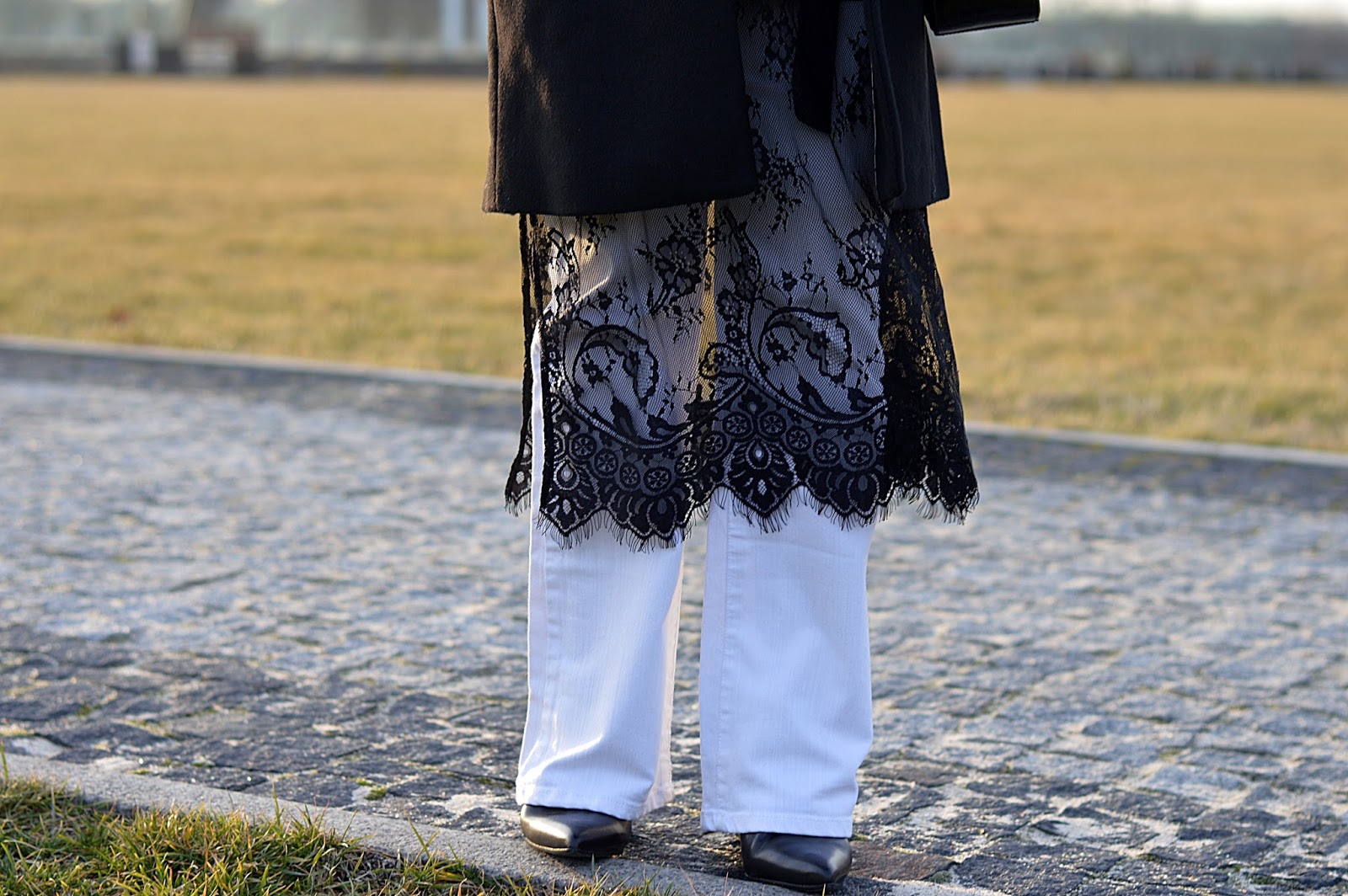 Koronkową tunikę wypatrzyłam na stronie Zary. Nie czekając na wyprzedaż  kupiłam. Są rzeczy, które trzeba kupić już! Koronki uwielbiam a ta długa tunika daje dużo możliwości. Tutaj chciałam dobrze ją pokazać stąd białe dzwony. Spokojny klasyczny płaszcz, żeby nie odwracać uwagi od gwiazdy tej stylizacji.