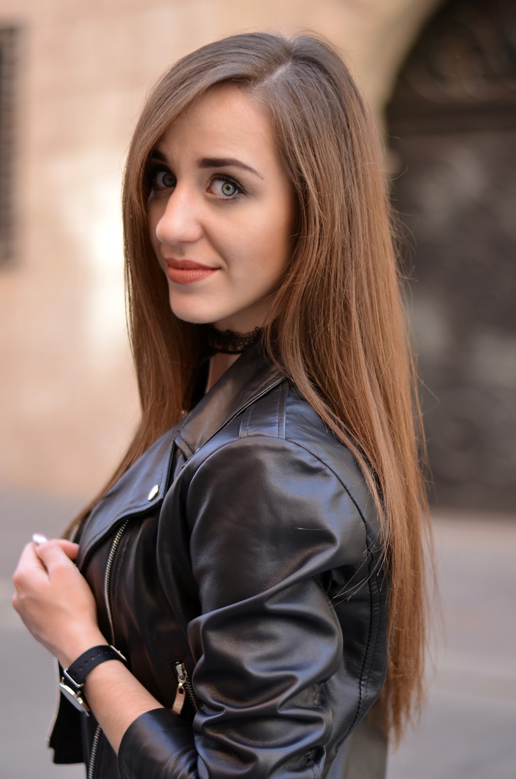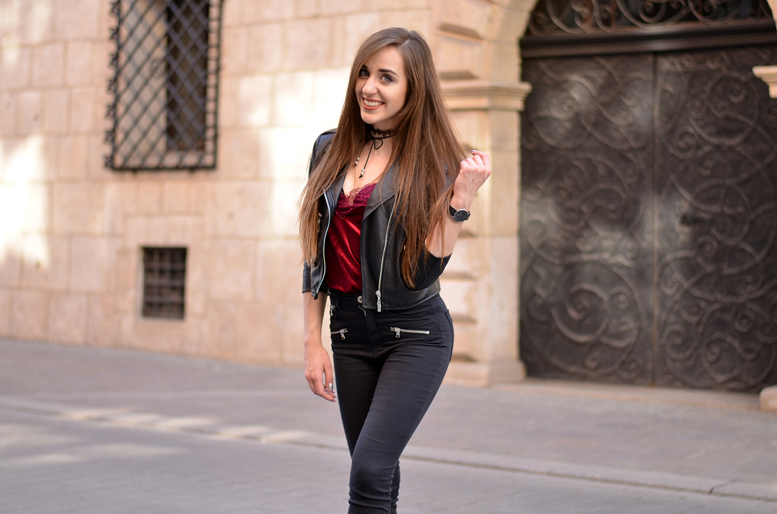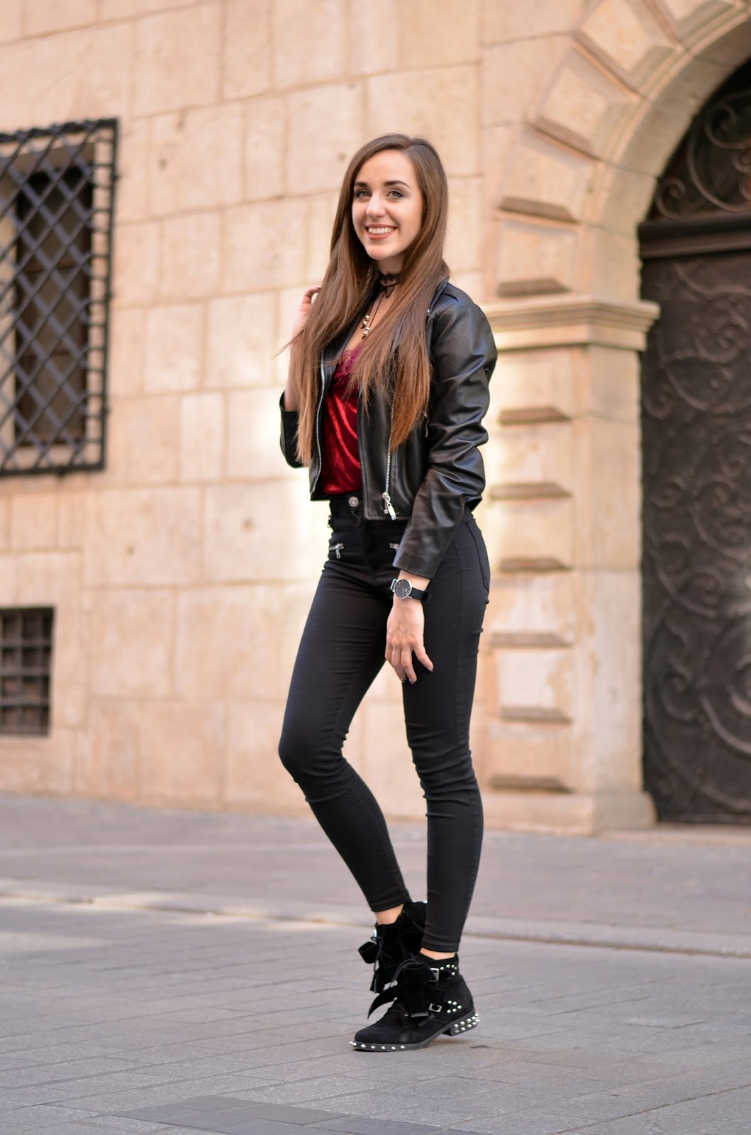Zobacz oryginał śr., 12/04/2017 - 20:00Cześć:) jak Wasze przygotowania do Świąt? Moje jeszcze w toku, gównie dlatego, że w tym tygodniu wypadają również moje urodziny. Przyszykowałam dla Was naprawdę fajną sesję z Krakowa na Wielką Sobotę z mnóstwem zdjęć, dlatego już teraz Was zapraszam;) Koniecznie zaglądajcie również na instagram @balaczka, tam codzienna dawka zdjęć i relacji:) Dzisiaj mam dla Was dużo czerni z dodatkiem bordo. Jest trochę rockowo, głównie przez buty z ostrymi ćwiekami. Bardzo dobrze się czuję w takich zestawach, zamieniając buty na szpilki równie dobrze mogłabym wyjść tak np do klubu. Natomiast w takim wydaniu świetnie sprawdzi się na wieczorne wyjście np w Krakowie (oj w Krakowie np na Rynek w szpilkach to ciężka sprawa po tej kostce;). Charakteru dodaje tutaj choker w połączeniu z bordową bieliźnianą bluzką z koronką. Polubiłam się z tym trendem:) Kolejna sesja z Krakowa, jeszcze nie raz tam zawitam biorąc aparat, bo zdecydowanie bardziej mi się podobają niż te robione w Nowym Targu. Prawdopodobnie dlatego, że większość miejsc tutaj już mi się po prostu znudziło, a lubię zmieniać otoczenie. Dajcie znać jak Wam się podoba całość:)