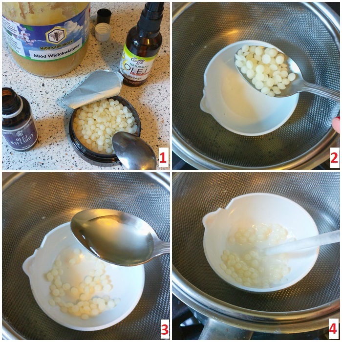Wszystkie składniki będziemy łączyć na ciepło, w kąpieli wodnej, dlatego potrzebne będą dodatkowe sprzęty: ja korzystałam ze swojej ceramicznej parowniczki oraz szklanej bagietki do mieszania. Do tego garnek z wodą, który stawiam na palniku oraz sitko, na którym położyłam parownicę. Zamiast typowego laboratoryjnego sprzętu, możecie użyć zwykłych kuchennych: małej miseczki i łyżki, one też się nadadzą.