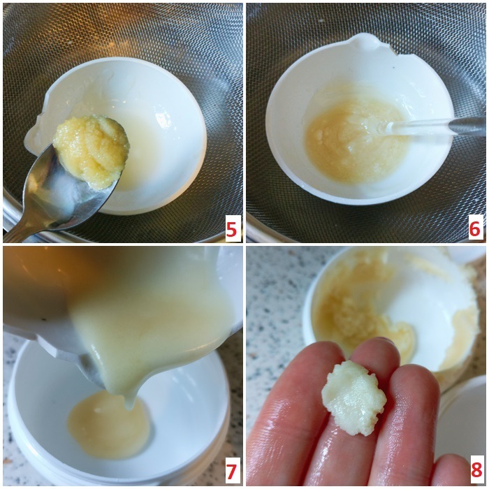 8. Tu widzicie moje pierwsze podejścia przy opracowywaniu receptury i proporcji balsamu. Niby wyszedł, funkcję swoją spełniał, ale konsystencja była nie do końca właściwa. Kruszyła się, a powinna być bardziej aksamitna, jak w gęstej pomadce. Prawidłowo wykonany balsam jest gładki, bez grudek i gęsty.