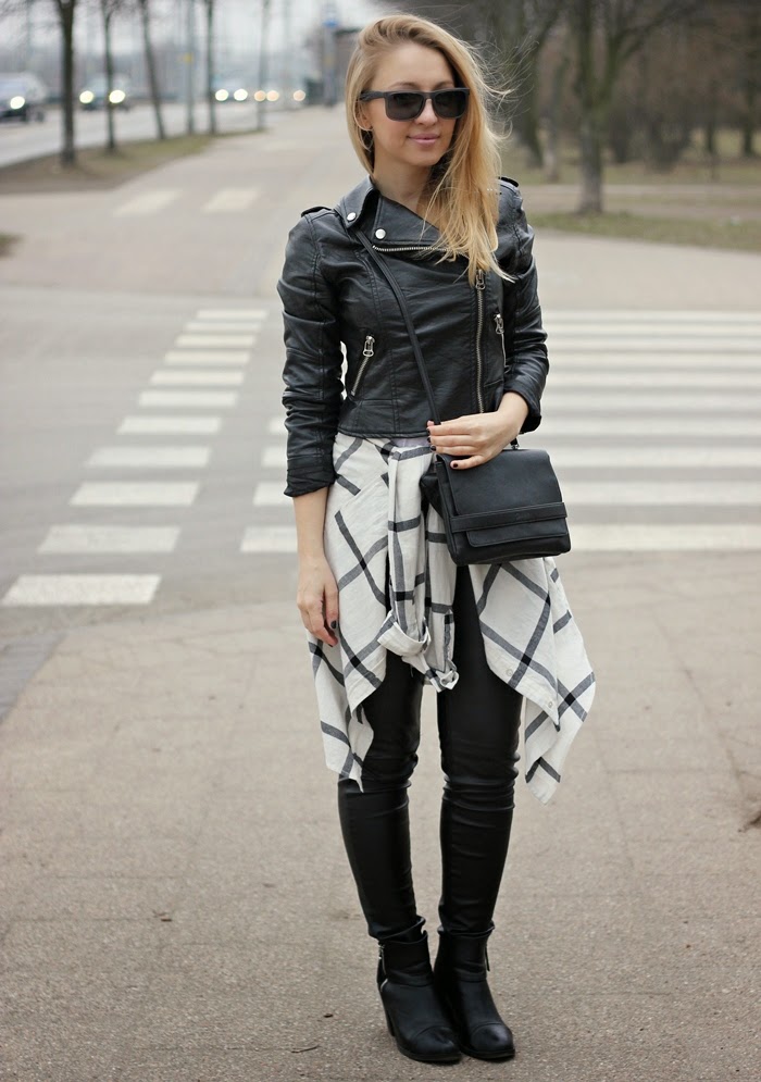 Zobacz oryginał pon., 02/03/2015 - 11:49W dzisiejszej stylizacji połączyłam skórzane spodnie i skórzaną kurtkę w identycznym kolorze. Aby nie przesadzić całość przełamałam kraciastą koszulą, którą przewiązałam w pasie. Pokazywałam już na blogu podobny outfit, w którym użyłam tej samej ramoneski, koszuli w kratę oraz spodni dżinsowych z dziurami na kolanach. Tym razem jednak wybrałam inny kolor koszuli i cały look w skórzanym wydaniu. To dlatego, że bardzo lubię tego typu rozwiązania na co dzień, koszula nadaje stylizacji charakteru i mogę ją swobodnie wiązać zarówno w przypadku spodni, sukienek jak i spódnic. A jak to wygląda u Was, lubicie kraciaste koszule? W jaki sposób je nosicie?