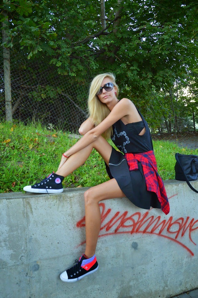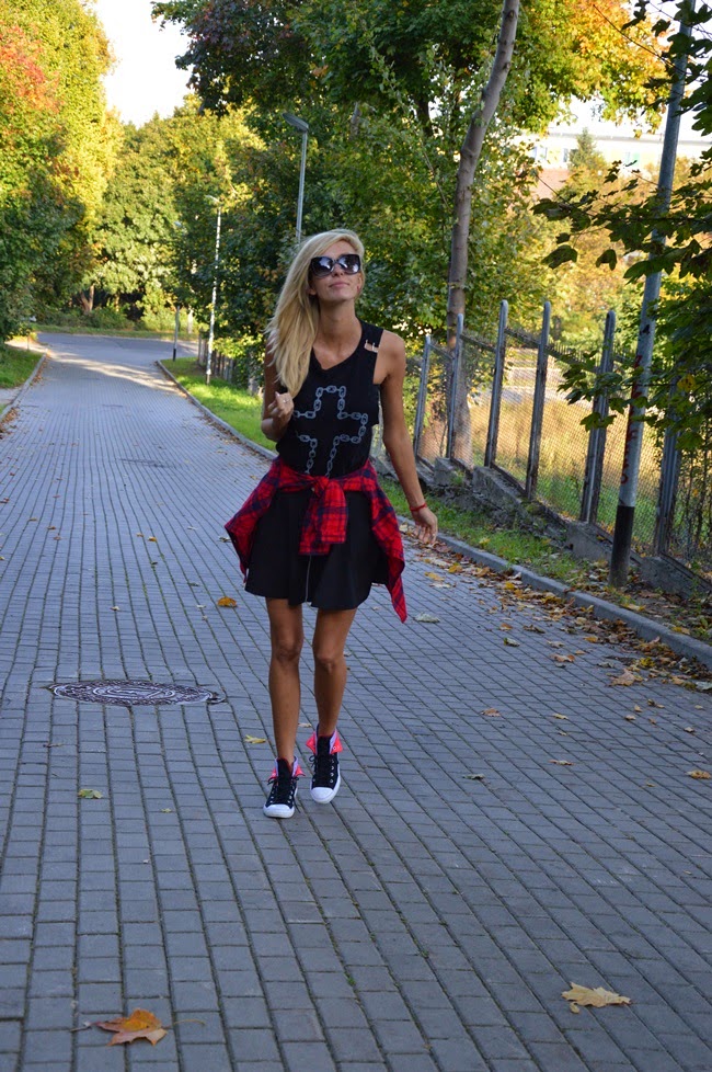 Zobacz oryginał pt., 03/10/2014 - 16:09Pozostajac w lekko mrocznym klimacie dzis prezentuje czarna spodnice z zamkiem, koszulke z nadrukiem krzyza, a wywijane conversy i czerwona koszula w krate dodaly "zycia i charakteru" tej stylizacji.