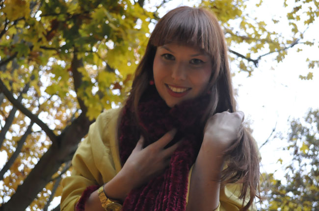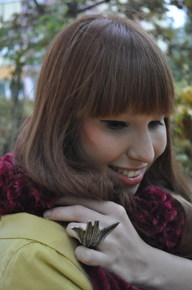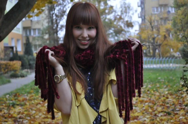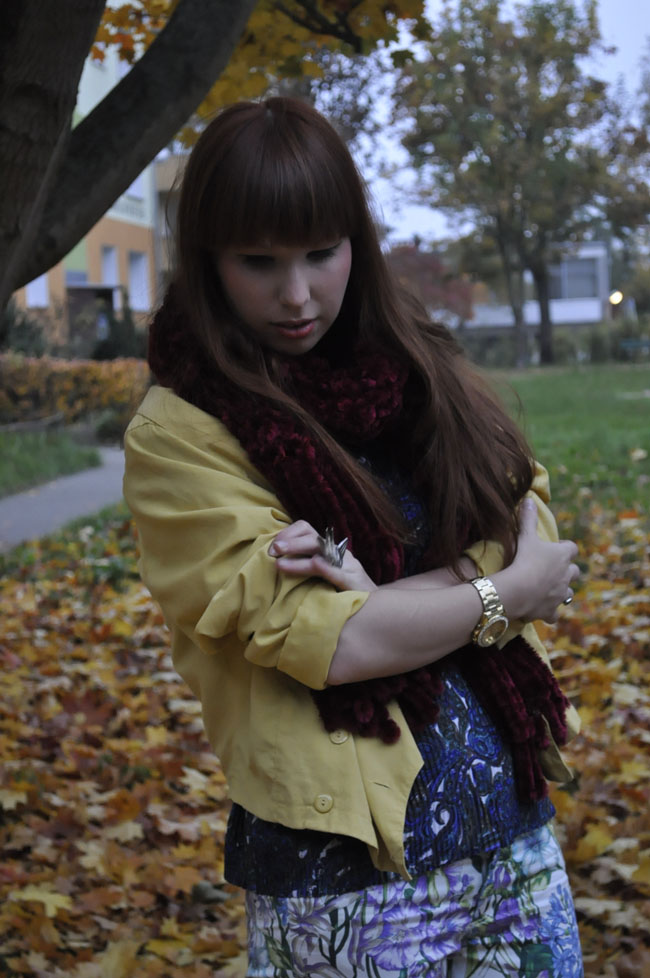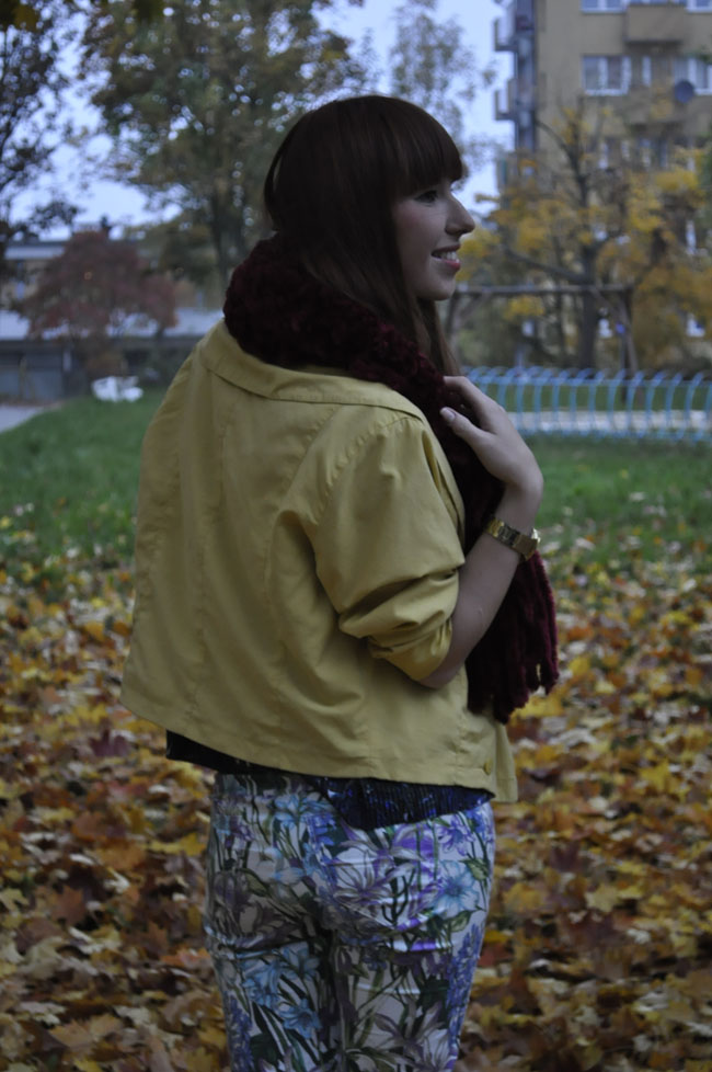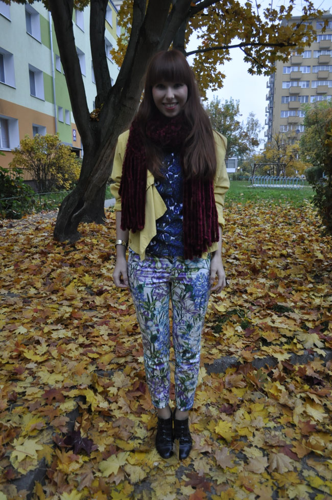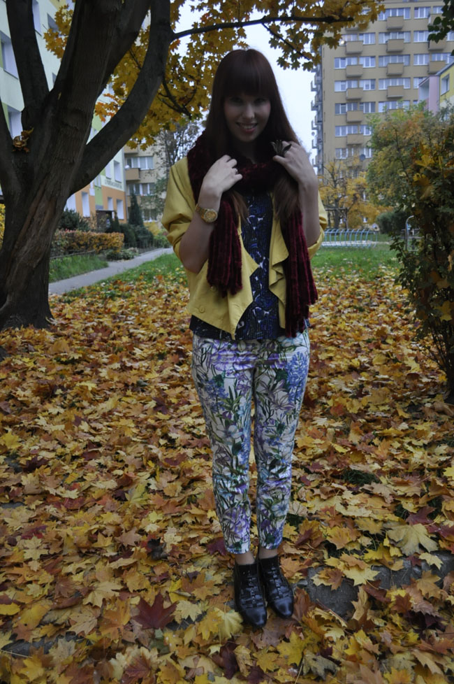 Spodnie z motywem kwiatowym połączyłam tym razem z wzorzystą bluzką utrzymaną w podobnej kolorystyce. Kurtka, która stała się ostatnio jedną z moich ulubionych. Pasuje do wielu stylizacji i jest swoistym przełamaniem kolorów. Wyróżniaja się tu również bordowy szal, który jest niewiarygodnie mięciutki i przyjemny. Do łask powróciły także moje smukłe botki sprzed kilku sezonów.
