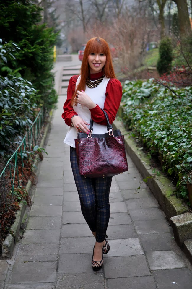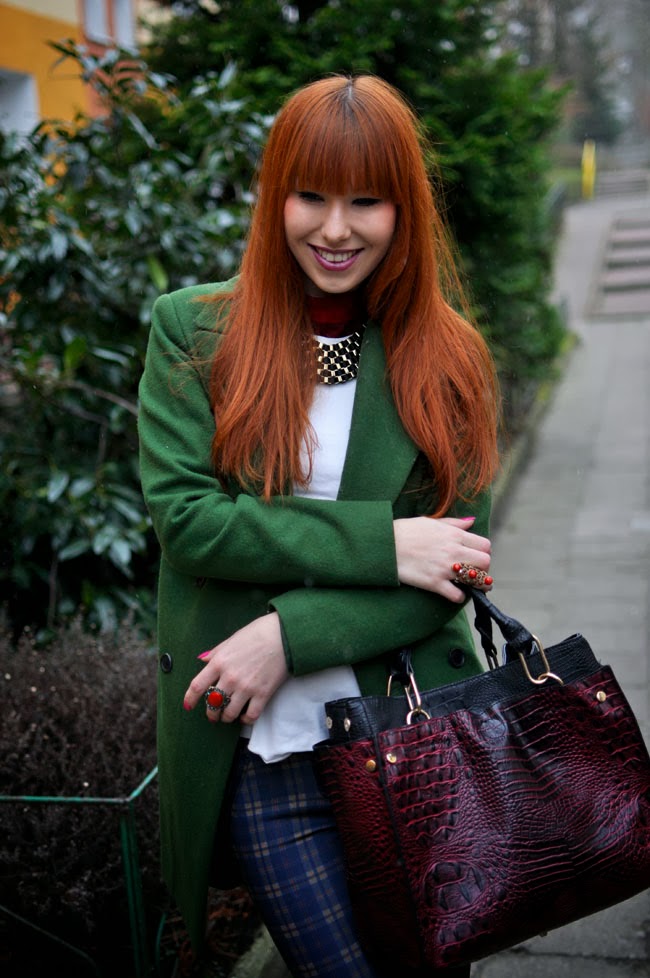 Niech z tej zadumy wyrwą Was zdjęcia z pewnej sesji, w której krata i zielony płaszcz ostro kontrastują z moimi rudymi włosami. Ostatnio pokochałam kraciaste spodnie, więc jeszcze nie raz tu zawitają. Dziś w połączeniu z delikatną baskinką i bordową koszulą. Złote dodatki po raz kolejny stały się dopełnieniem całości. Buty w panterkę są drobnym przełamaniem, uwielbiam kiedy wzory mieszają się, niekiedy mogą stworzyć naprawdę fantastyczną całość.