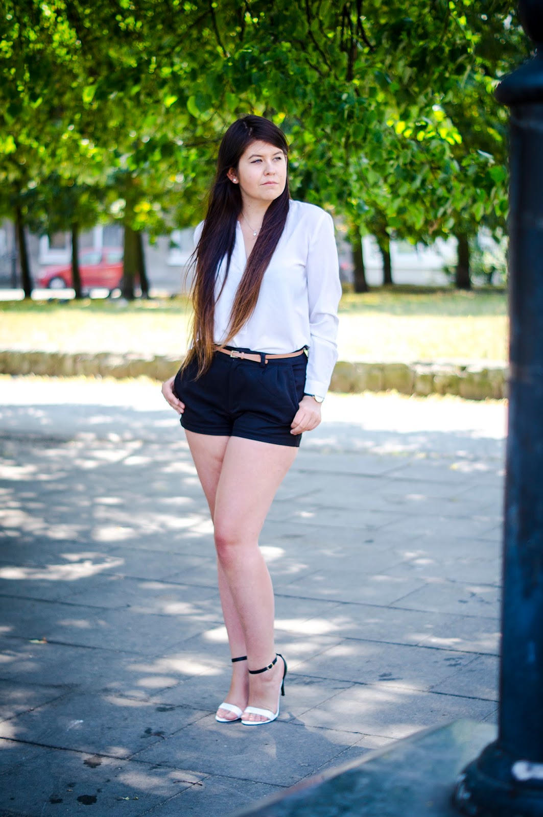 Dziś letnio i elegancko. Bluzka biała z wyciętym dekoltem w serek ale bardzo wąskim. Do tego szorty z wysokim stanem koloru czarnego razem z paskiem. Sandałki na szpilce, od Dezee specjalnie od Vices, które wysmuklą sylwetkę w kolorach bieli i czerni. Wszystko razem komponuje się w elegancką stylizacje.