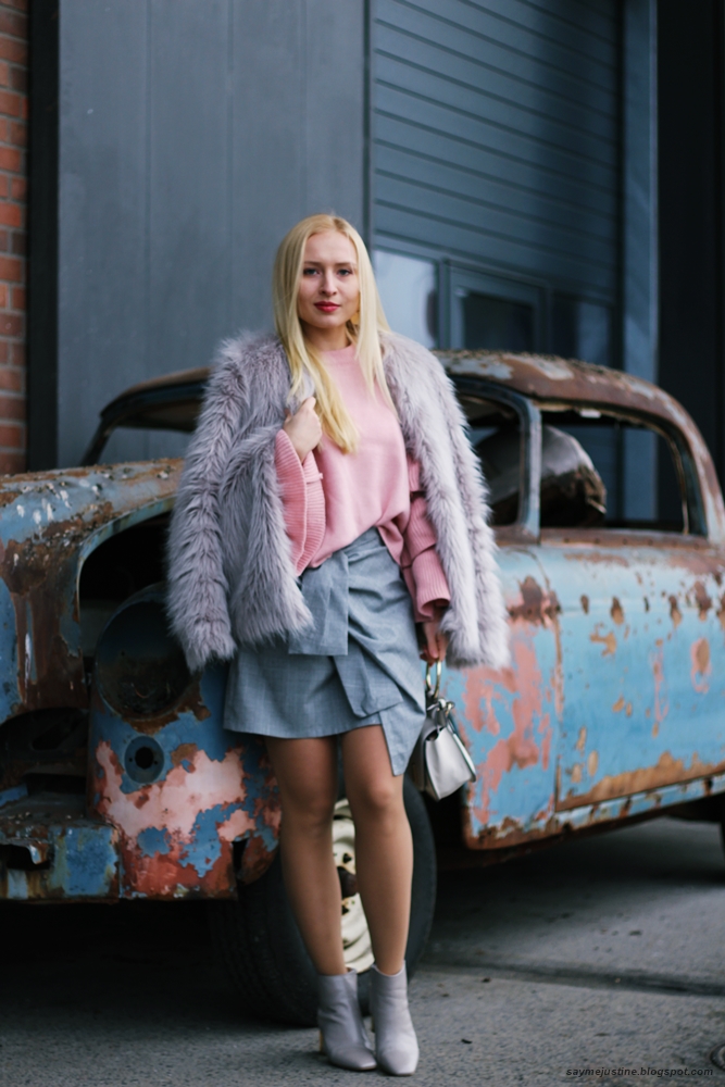 Polaczenie szarego z jasnym rozem to idealna kombinacja, w dzisiejszym poscie pokaze wam moja interpretacje :) Szara kratka dominuje juz od jakiegos czasu, obojetne czy spodnie, marynarki czy spodnice, to jest obecnie "must have", ja zdecydowalam sie na spodnice i zeby nie bylo zbyt ponuro (za oknem jest wystarczajaco ponuro) dobralam do niej pudrowy sweter z szerokimi rekawami, ktore obecnie tez przezywaja swoje 5 minut w swiecie mody ;) Futro jest oczywiscie sztuczne i od kilku sezonow nalezy do mich ulubionych!
