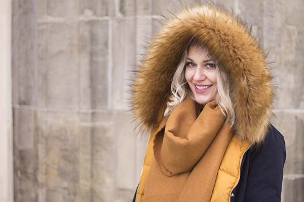 Sukienka zachwyciła mnie swoim krojem. Dół zakończony jest czterema falbanami, a rękaw typu dzwon to hit ostatniego sezonu. Do sukienki dobrałam zamszowe botki na słupku z kokardą z boku. Na wierzch narzuciłam dwustronną kurtkę puchową. Do tej pory byłam przeciwniczką kurtek puchowych. Zawsze uważałam, że płaszcz jest bardziej funkcjonalny i bardziej pasuje do mojego trybu życia. Jednak ta kurtka skradła moje serce, ponieważ ma idealną długość, krojem bardziej przypomina płaszcz niż kurtkę, ma kaptur z odpinanym, sztucznym futrem oraz jest dwustronna. Można ją nosić na granatowej lub musztardowej stronie. Jest to bardzo funkcjonalne rozwiązanie. Kolorystycznie postawiłam na granat, przełamując go karmelowym brązem.