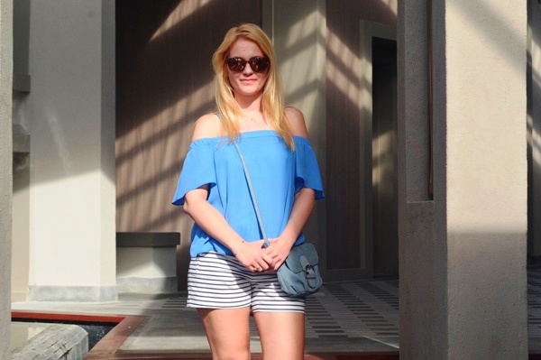 Dzisiaj wybrałam zestaw, który się sprawdzi zarówno w mieście jak i na plaży. Nie mogło zabraknąć szortów w marynarskie paski i bluzki z hiszpańskim dekoltem zwany też carmen. Kobiecy, romantyczny i eteryczny. Odkrywa ciało ze smakiem. Nie jest nachalny. Coś dla romantyczek takich jak ja :) Pamiętajcie jednak, że ten fason poszerza ramiona. Jeśli masz ramiona szersze niż biodra, wówczas polecam bluzki odkrywające jedno ramię. Te z Was, które mają budowę gruszki, tak jak ja, to model dla Was! Bluzka hiszpanka ładnie wyrówna proporcję między szerokimi biodrami, a szczupłymi ramionami.