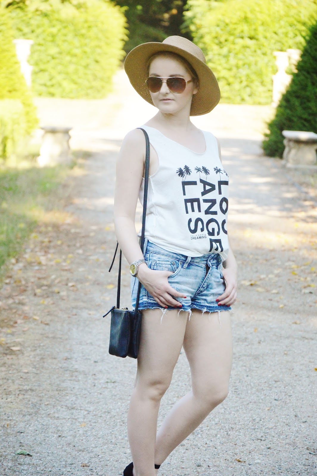 Top- Mango / Shorts- H&M / Hat- Stradivarius / Sandals- Bershka / Sunglasses- No name / Watch- Claire's