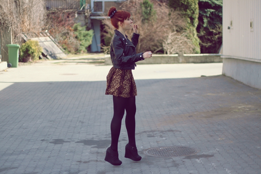 Zobacz oryginał pon., 09/04/2012 - 17:33Jestem wielką fanką panterkowego printu. Najbardziej lubię go na dodatkach, na ubraniach mniej, lecz ta rozkloszowana spódniczka z Zary od razu wpadła mi w oko i musiałam ja miec! Świetnie się układa i uszyta jest z fajnego materiału, który się nie gniecie. Możecie ją kupić tu. Ostatnio pojawiło się wiele stylizacji z tą właśnie spódnicą na innych blogach, w związku z czym narastały we mnie obawy czy moja stylizacja wypadnie równie dobrze jak innych dziewczyn. Po zastanowieniu postawiłam na rockowe klimaty. Spódnicę zestawiłam z czarną ramoneską z H&M, genialnymi koturnami z sequinshoes.pl oraz koszulką z panterkowym sercem DIY. Rockowe akcenty to wstążka z czaszkami, którą owinęłam koka oraz torba z ćwiekami. A na końcu zdjęcia na którym się uśmiecham (na życzenie kilku osób które mnie o to prosiły....)