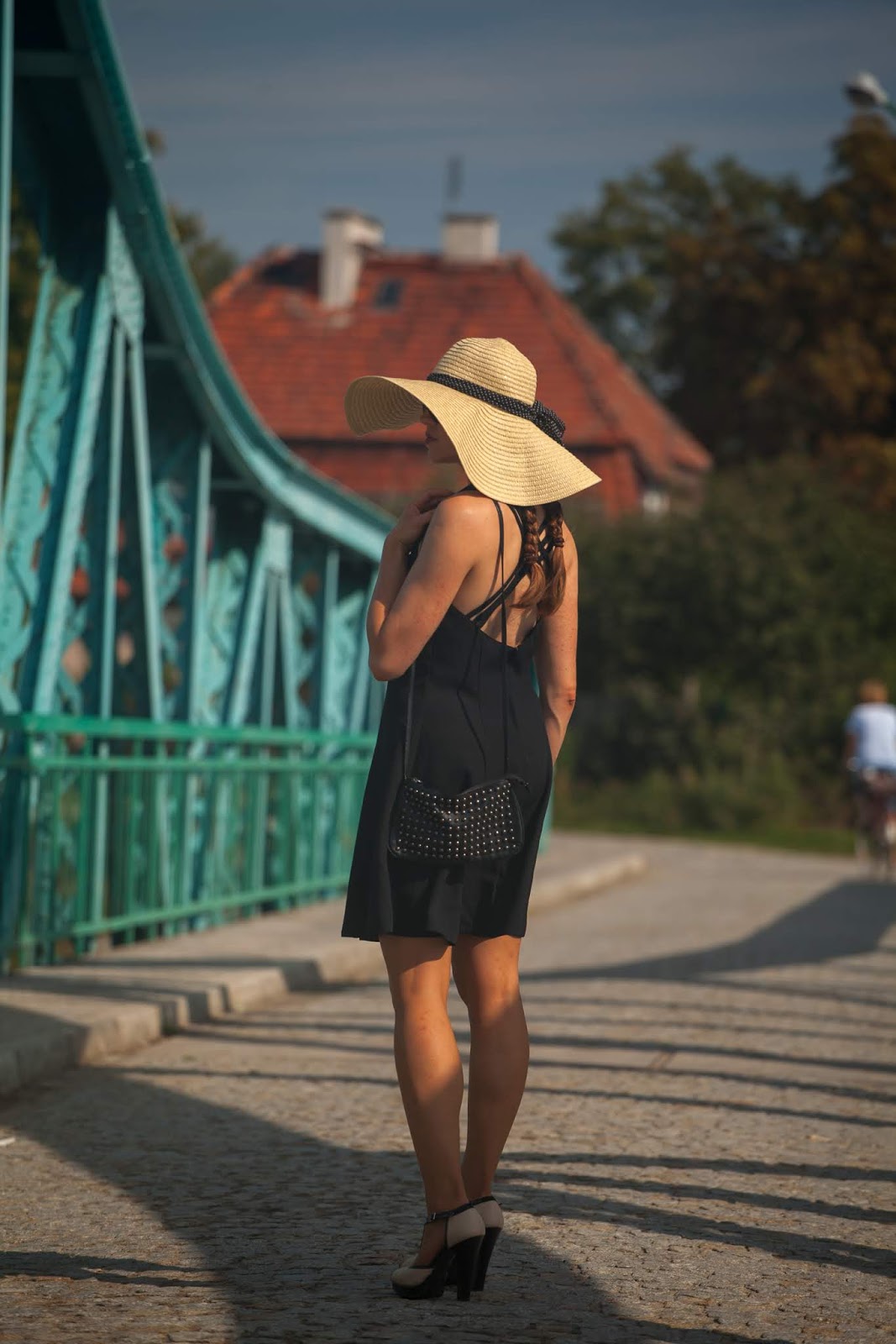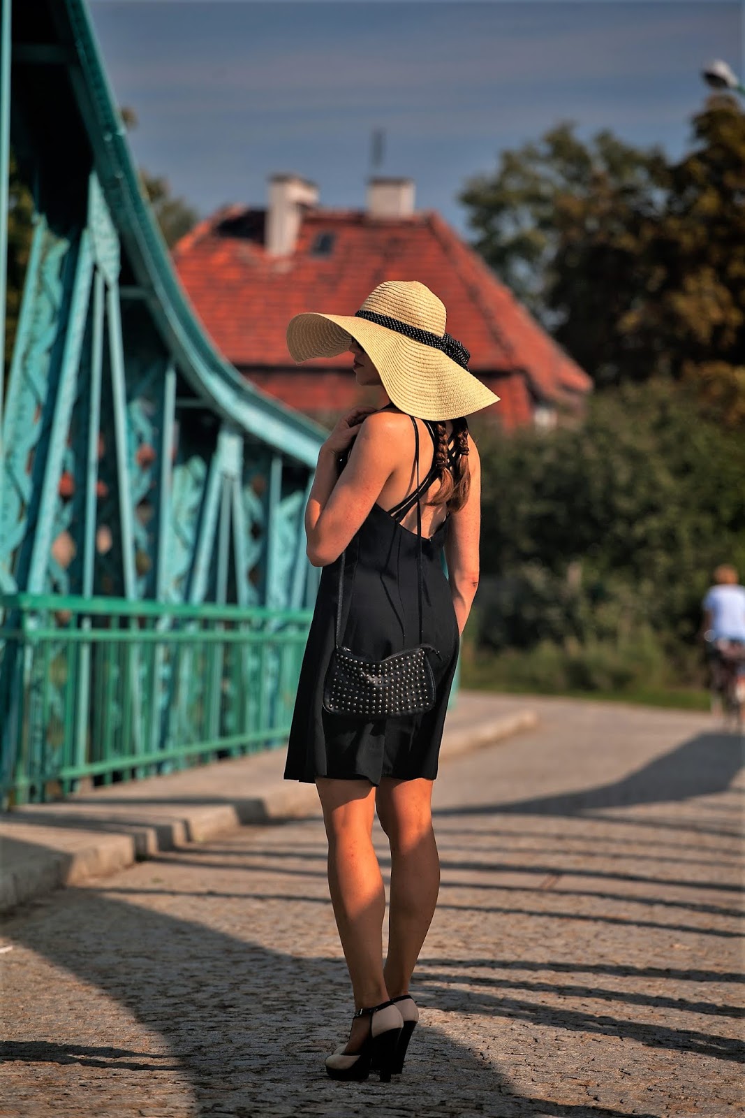 Ja akurat zestawiłam ją ze złoto-czarnymi dodatkami, pod kątem randki, a nie rozdania dyplomów chłopaka. Wybrałam naszyjnik z czarnego sznura ze złotymi, metalowymi elementami, który wygląda nieco jak afrykańska biżuteria oraz bransoletki, które łączą się kolorystycznie z akcentami w kolorze nude i tymi złotymi, jak również ze słomkową wersją kapelusza.