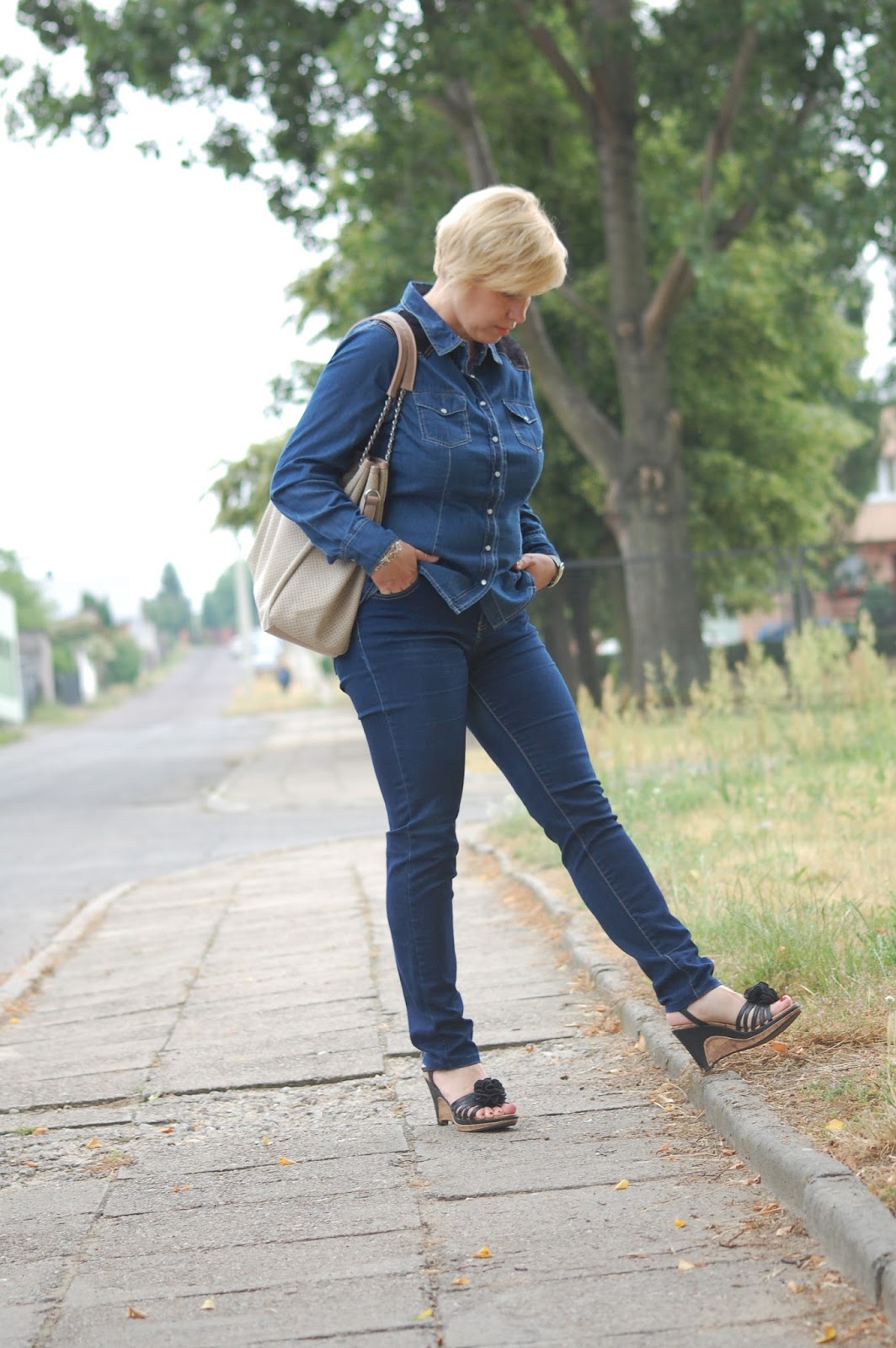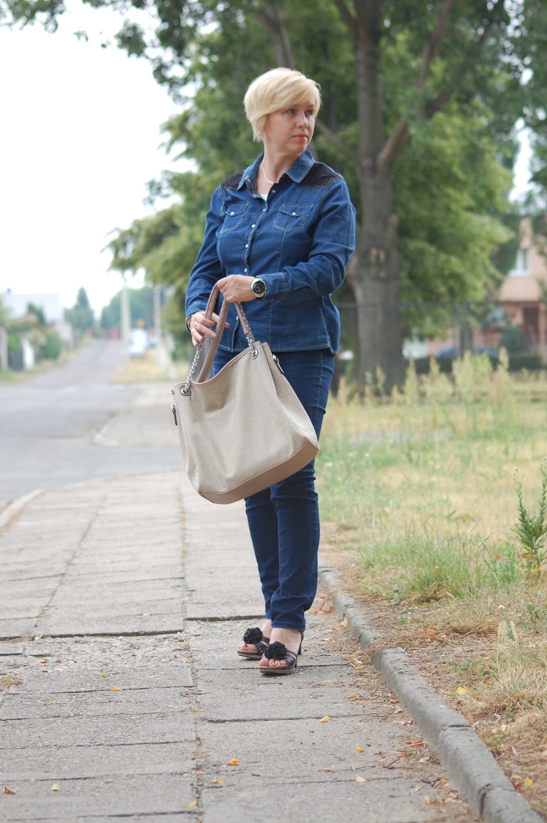 Niestety póki co to słabo się do Nas spieszy. Co prawda źle nie jest, bo dni w kratkę. Wczoraj np. było cieplutko, a dziś też ciepło, ale szaro, bez słońca i po deszczu. Dlatego też dziś moja stylizacja taka a nie inna, czyli koszula z długim rękawem, dżinsowa, spodnie i sandały na korku. I jestem cała na dżinsowo. A ponieważ dżins nieprzemijająco na tronie więc jest ok. Stylizacja luźna, na co dzień, do pracy ( niestety pracująca niedziela ) i dobra na takie mało słoneczne dni jak dzisiaj. Do następnego razu.